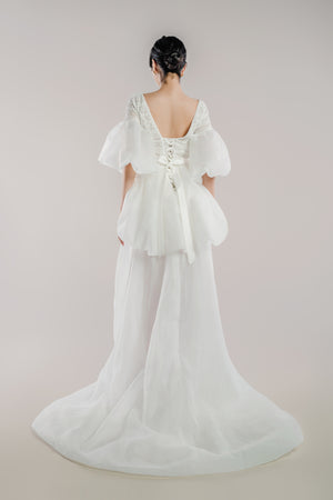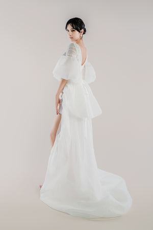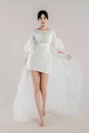 Structured in intricate lace, the mini silhouette is framed by voluminous organza puff sleeves, striking a perfect balance of softness and strength. A detachable sweeping train cascades from the waist, transforming the look from contemporary party-ready to timeless bridal drama.