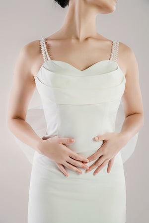 Crafted in luxurious satin, the sleek column silhouette is paired with a softly draped neckline and delicate pearl-beaded straps that trace into a dramatic open back.