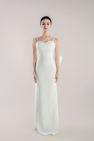 Sheath Satin Wedding Dress with Pearl Straps, Sweetheart Neckline & Statement Bow Train - Celestine. WL Bridal & Gown