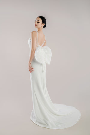At the base, an oversized organza bow floats above a sweeping train — a perfect blend of minimalism and romantic flair.