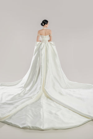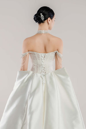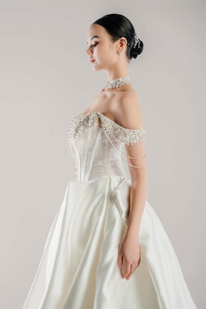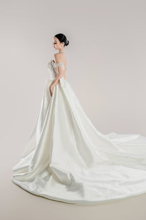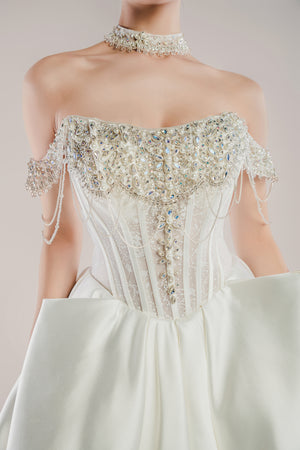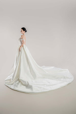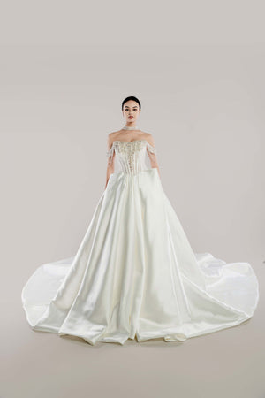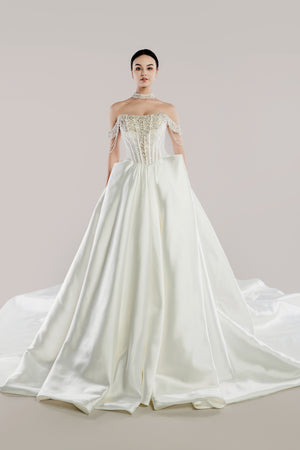 Off Shoulder Beaded Corset Ball Gown Wedding Dress with Satin Skirt and Cathedral Train - Aurélia. WL Bridal & Gown