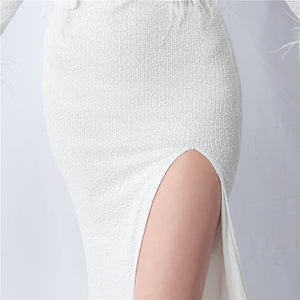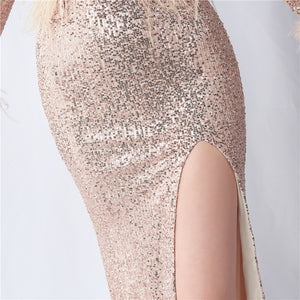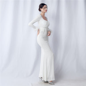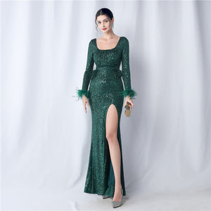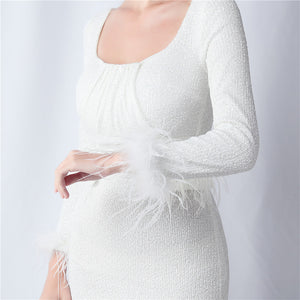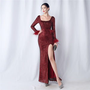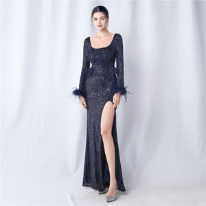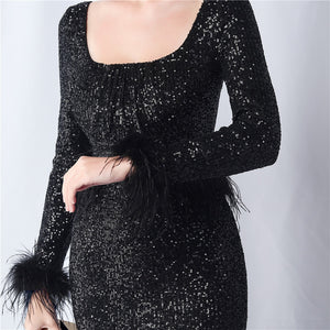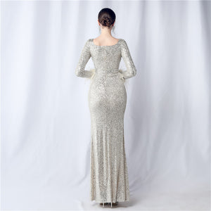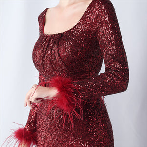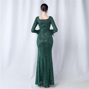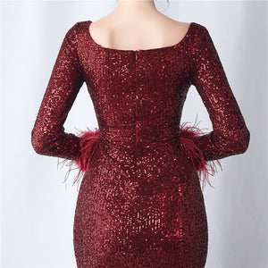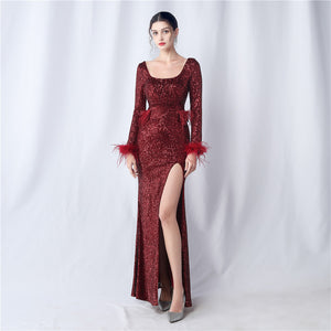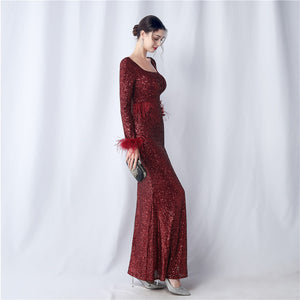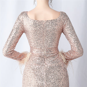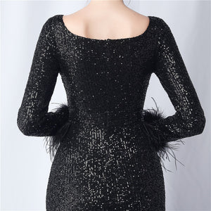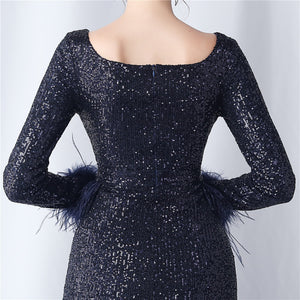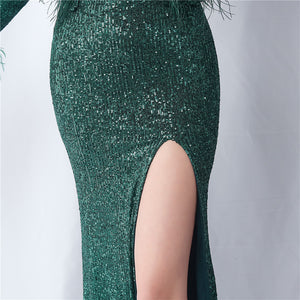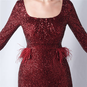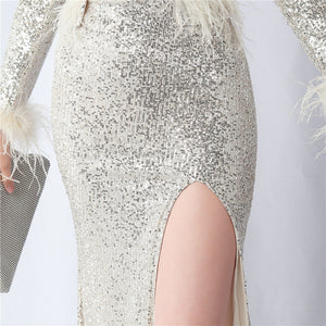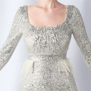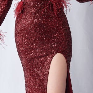 Long-sleeve sequins + intricate ostrich feather beading, with chest pads.