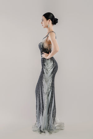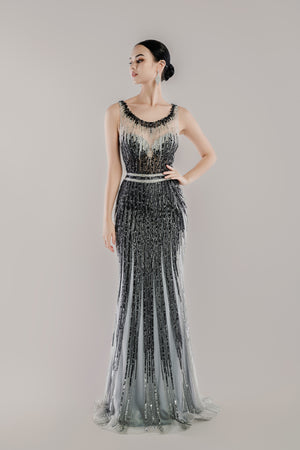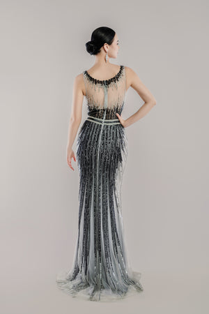 Crafted with thousands of hand-sewn beads that cascade like stardust over the sheer illusion bodice, it shimmers with every step — a true symphony of sparkle and silhouette.