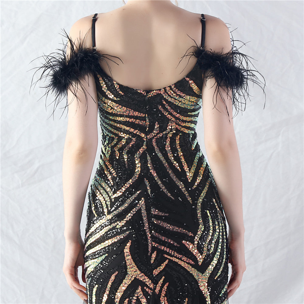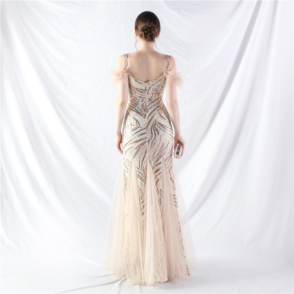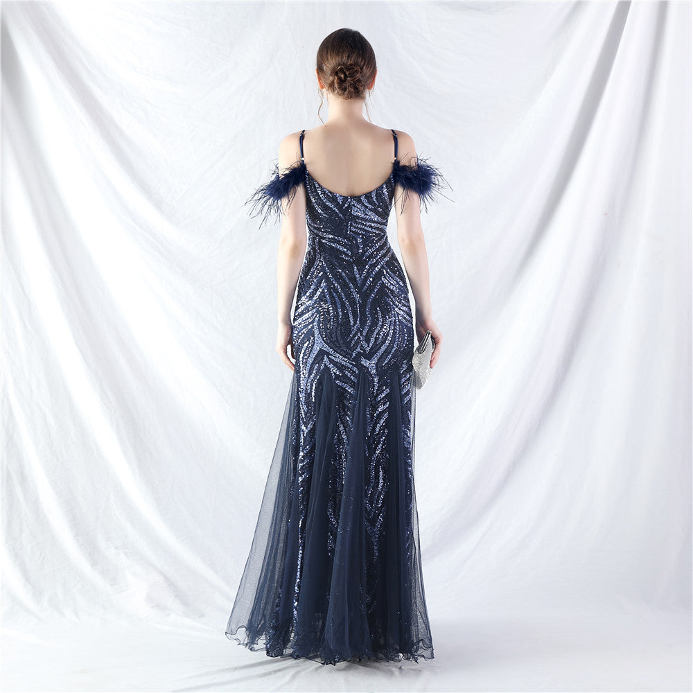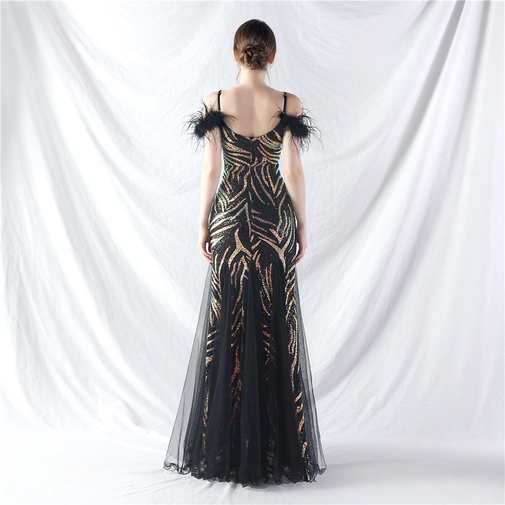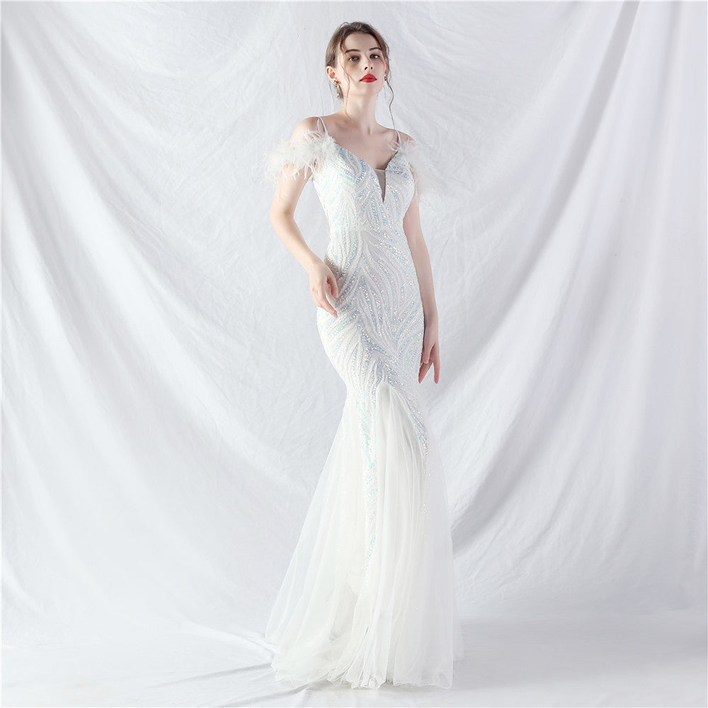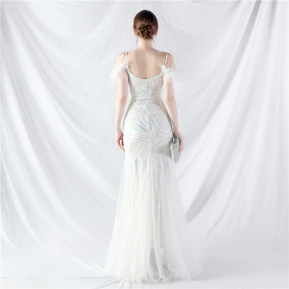 To ensure the best effect of the ostrich feather decorations, please use a hair dryer to gently fluff and smooth the feathers before wearing the gown. (Please use the hair dryer safely.)