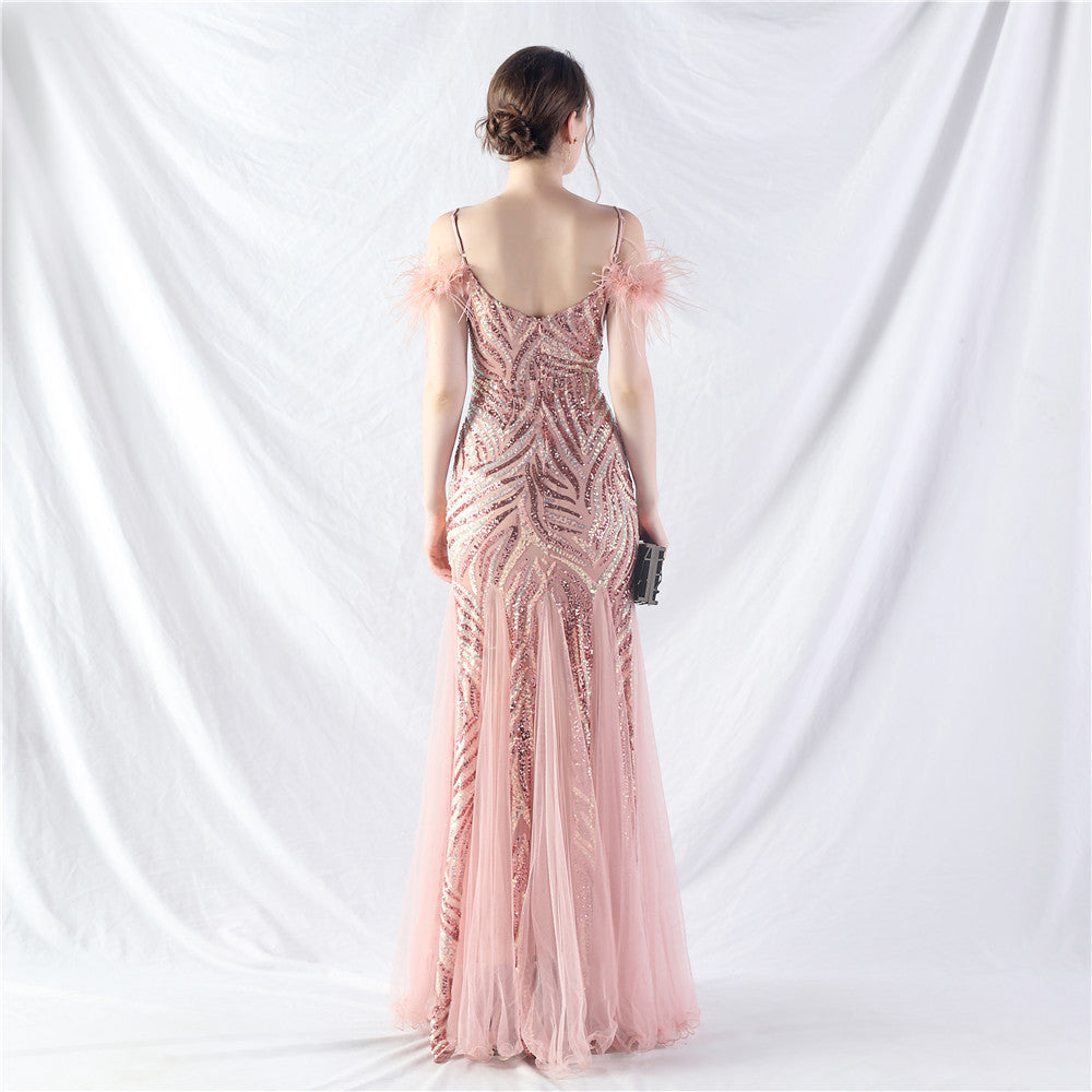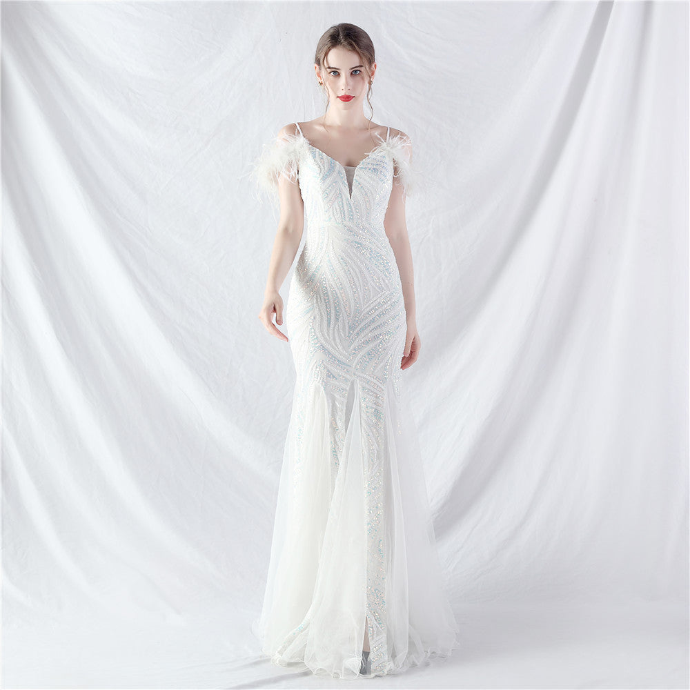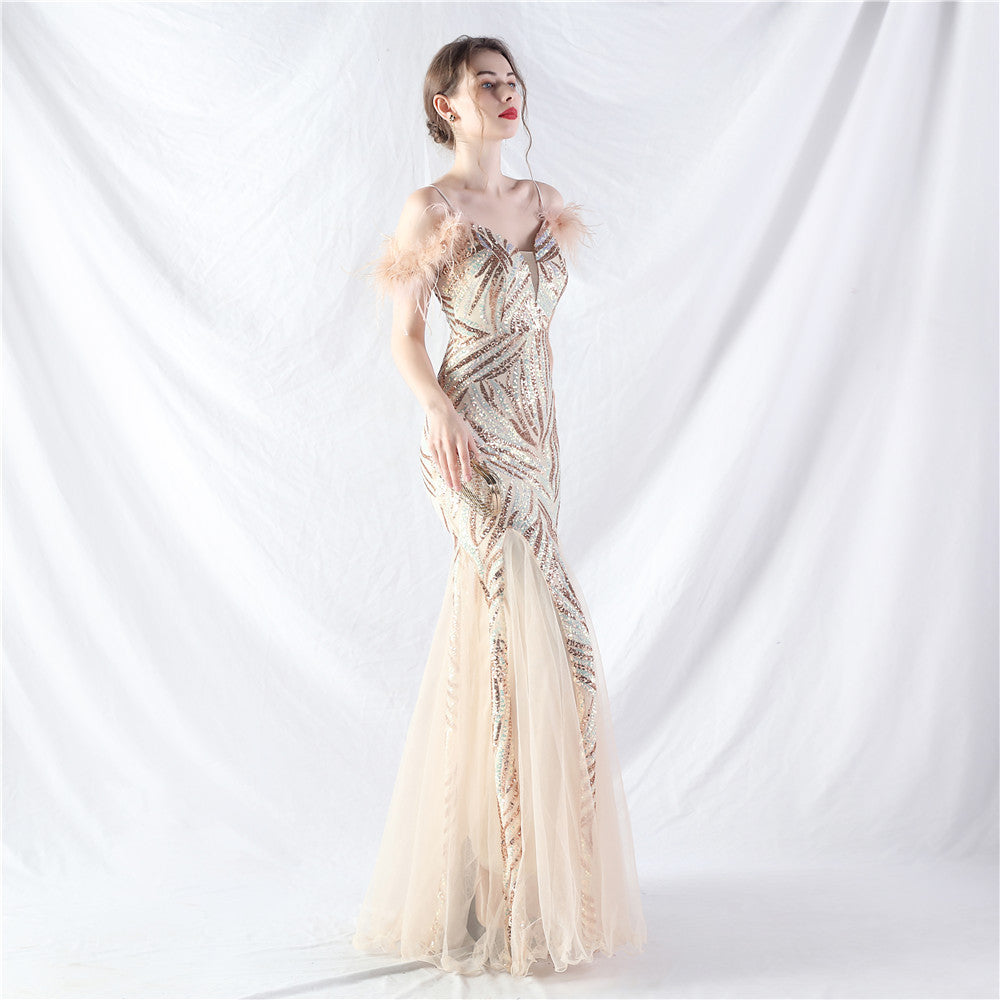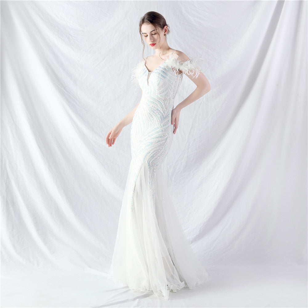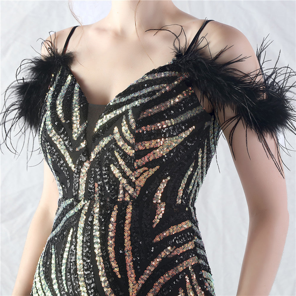 To ensure the best effect of the ostrich feather decorations, please use a hair dryer to gently fluff and smooth the feathers before wearing the gown. (Please use the hair dryer safely.)