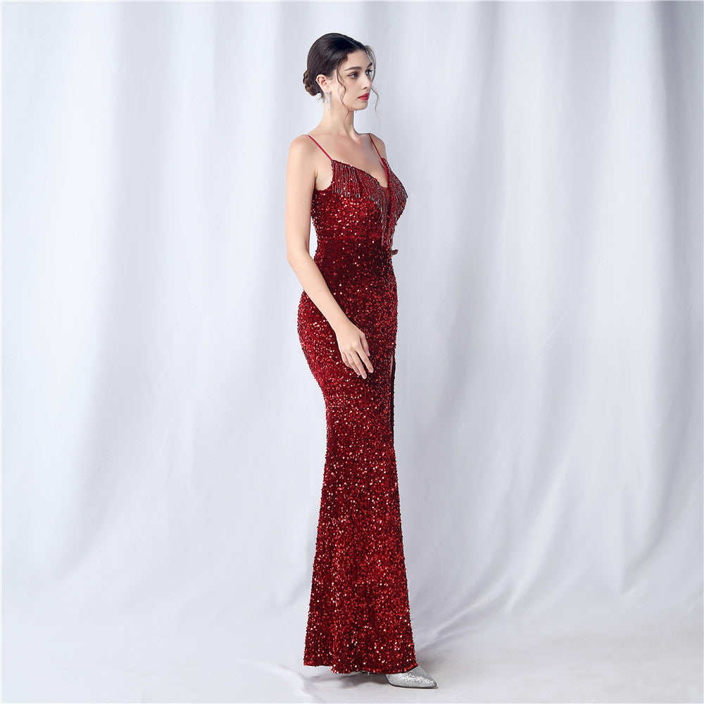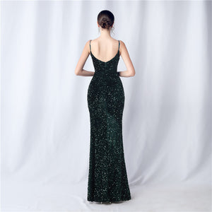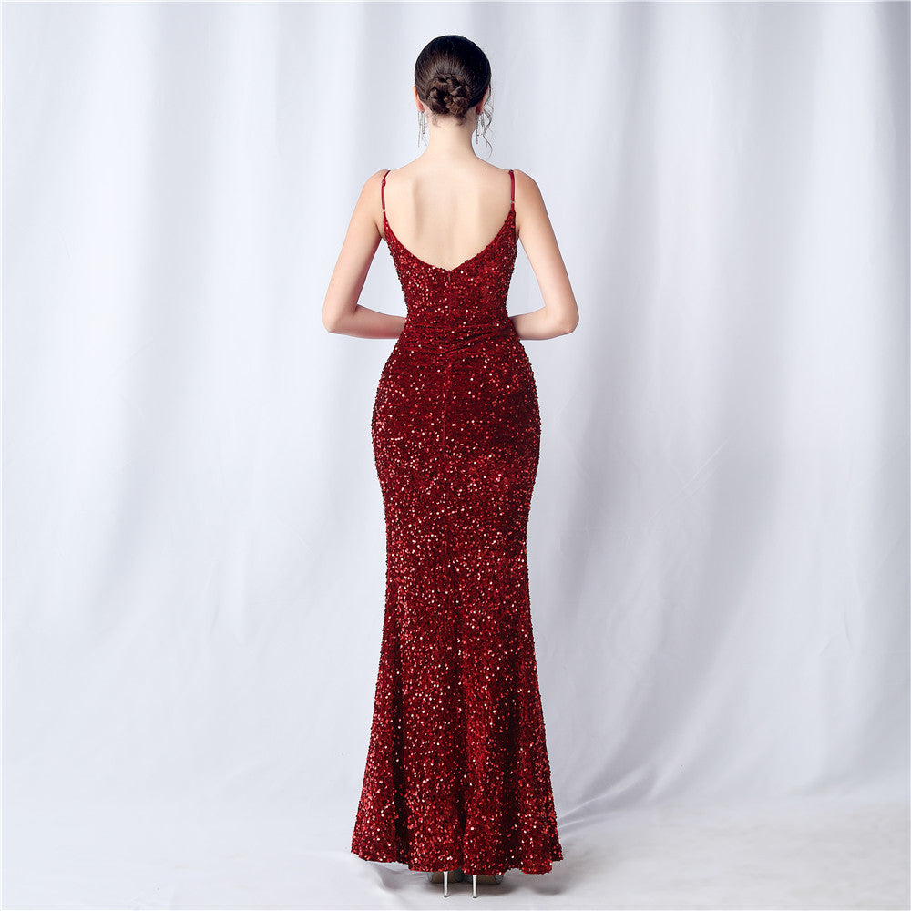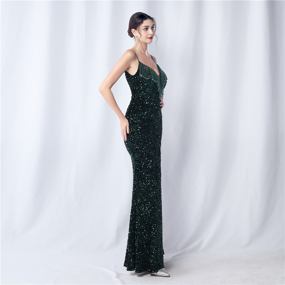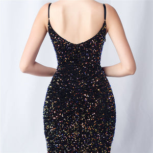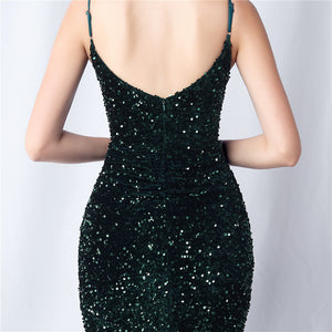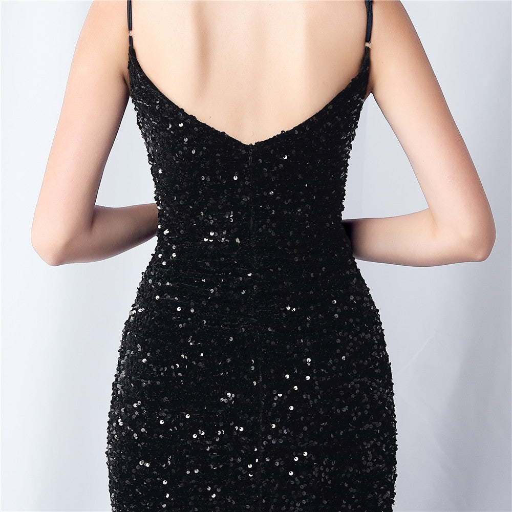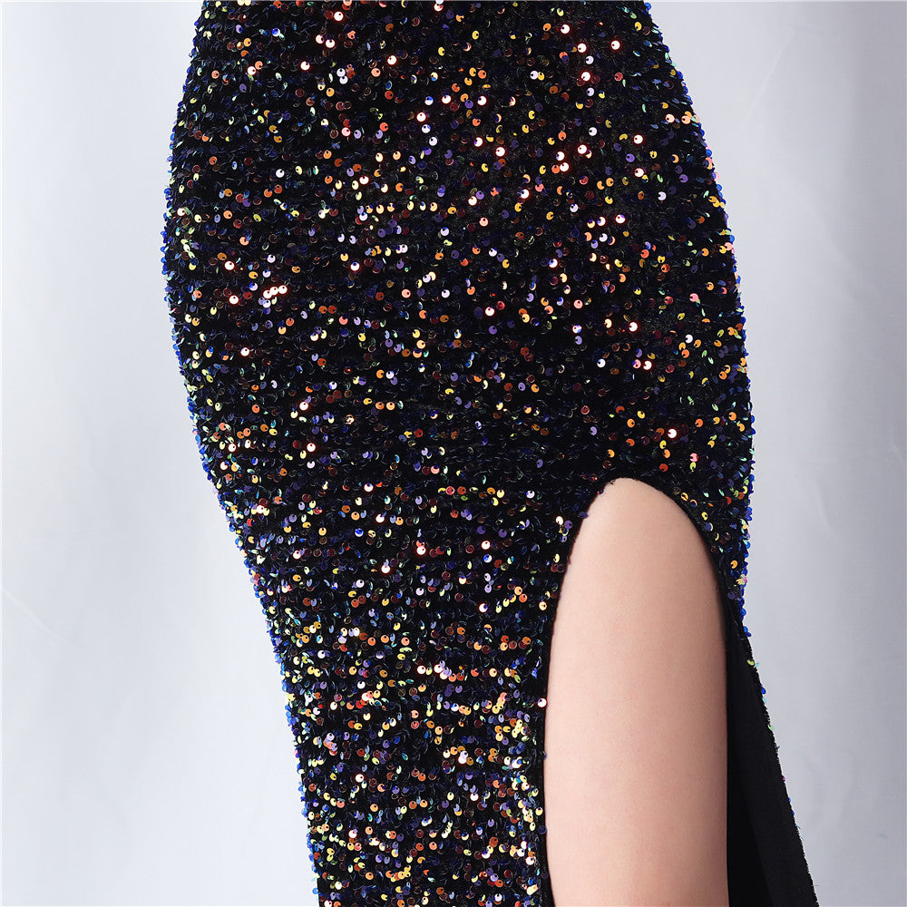 Velvet base with hand-sewn sequins and intricate beading, includes built-in chest pads