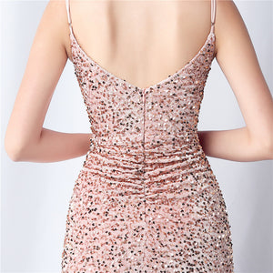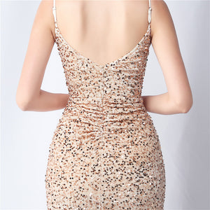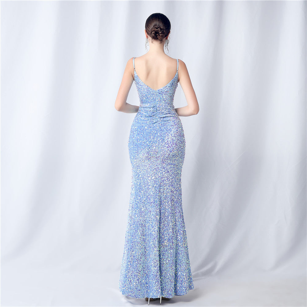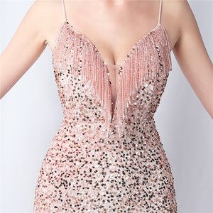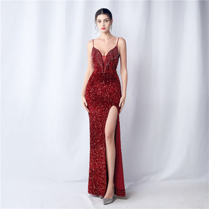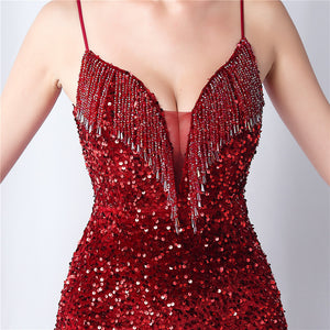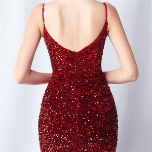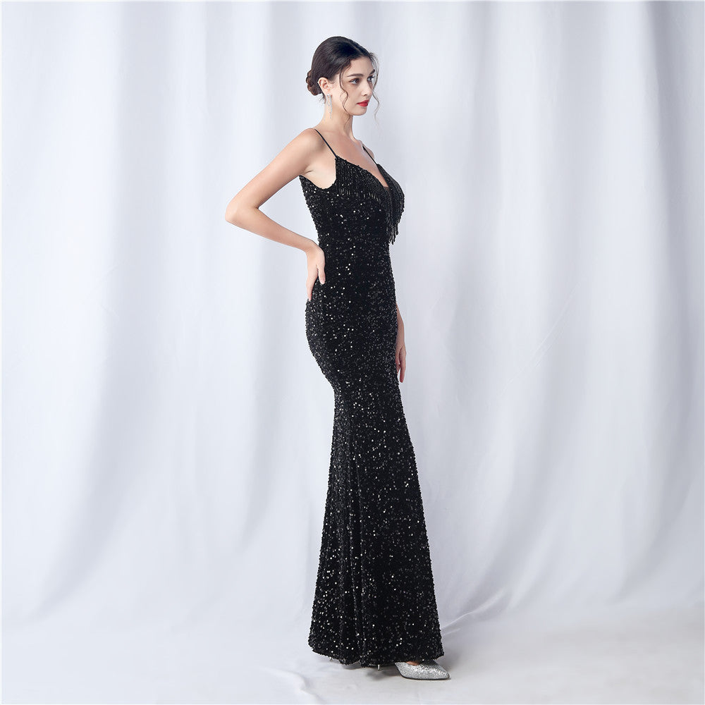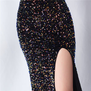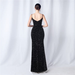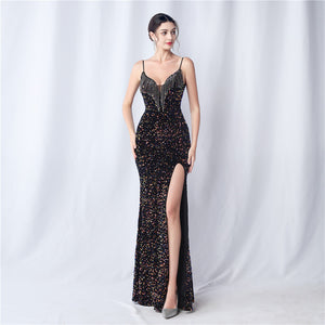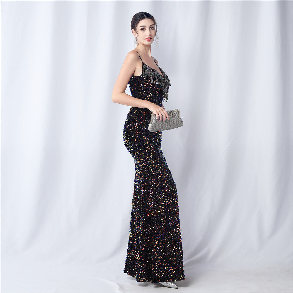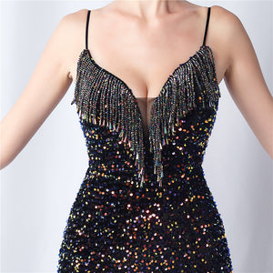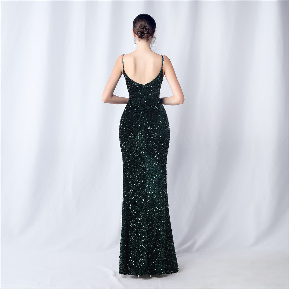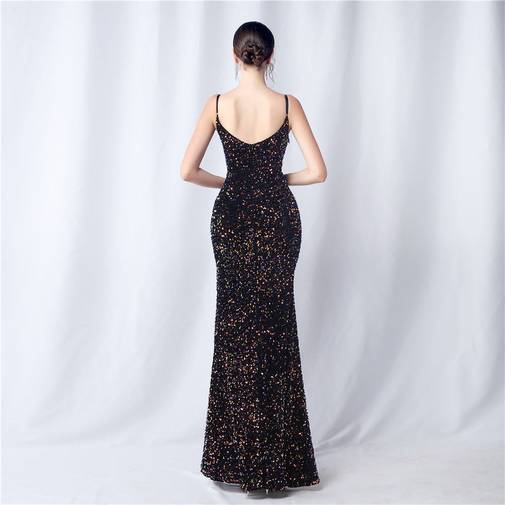 Velvet base with hand-sewn sequins and intricate beading, includes built-in chest pads