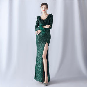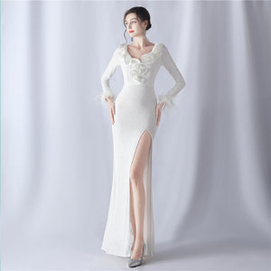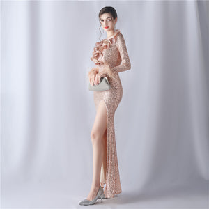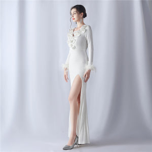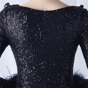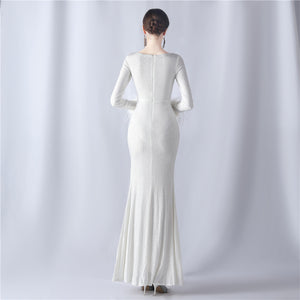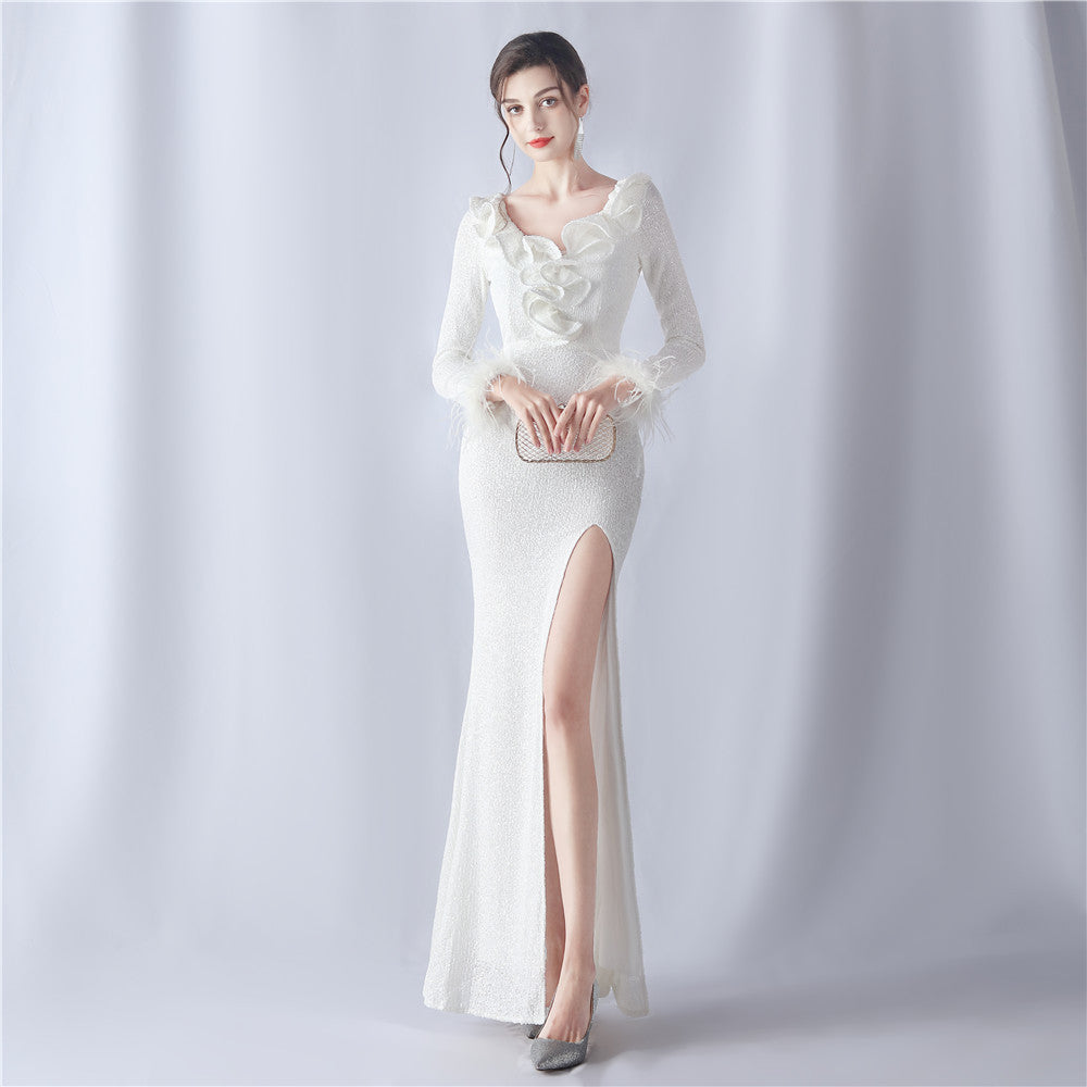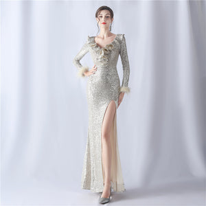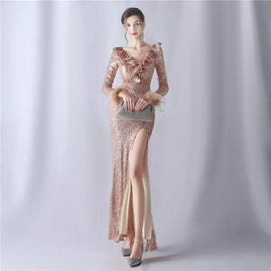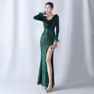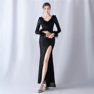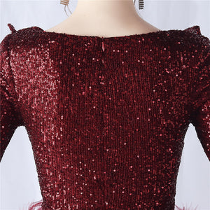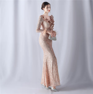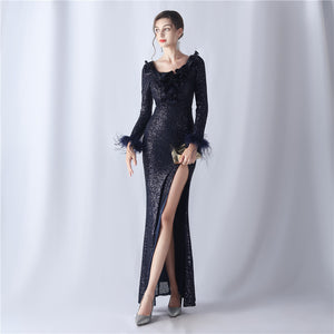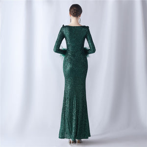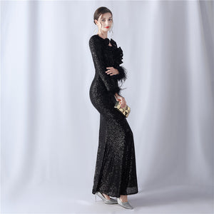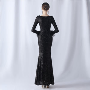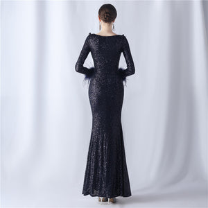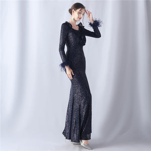 Wave-pattern sequin beading on chest + ostrich feather detailing, sequin embroidery,