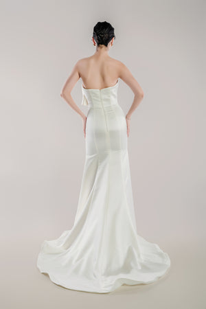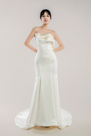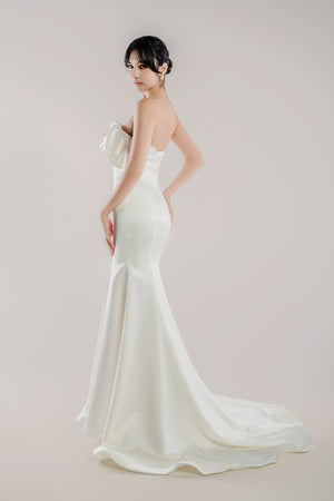 Crafted in lustrous satin, the mermaid silhouette sculpts the figure with clean, graceful lines. A sculptural bow accents the strapless neckline, adding a romantic focal point, while the sweep train flows effortlessly for a refined finish.