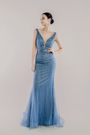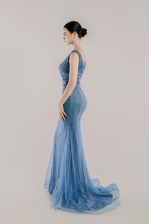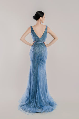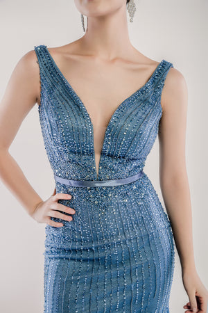 Plunging V-Neck Blue Mermaid Gown with Hand Beading and Sweep Train