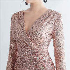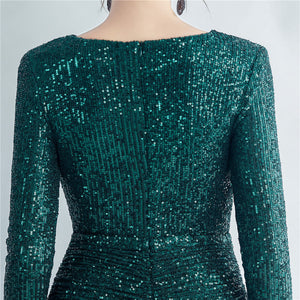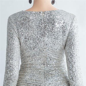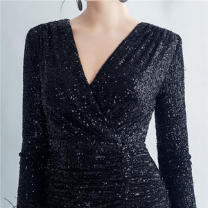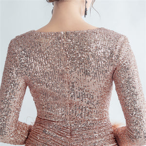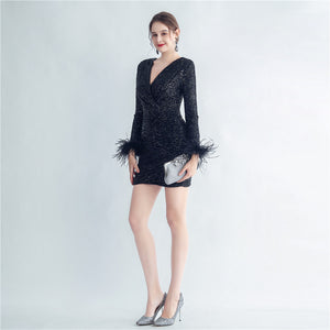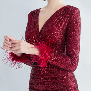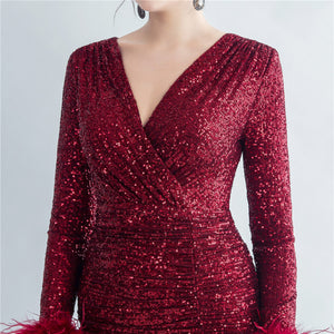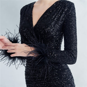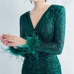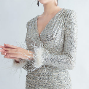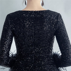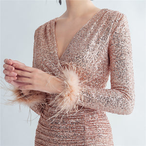 Crafted Bespoke Ostrich Fur Sequin Long Sleeve Formal Dress