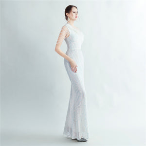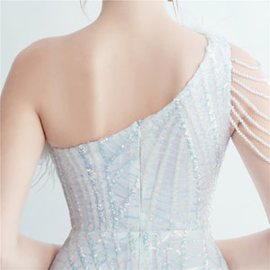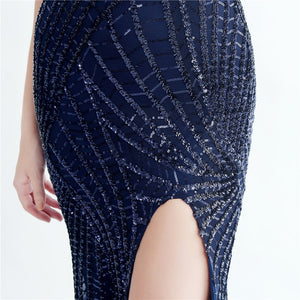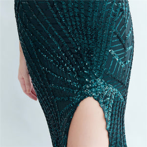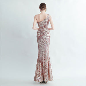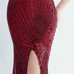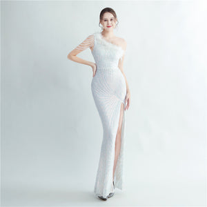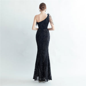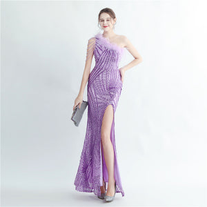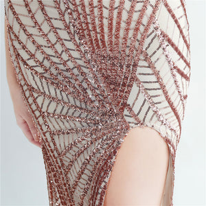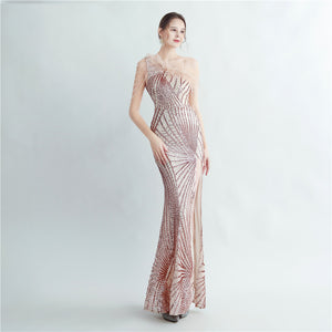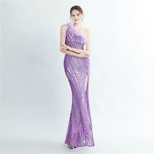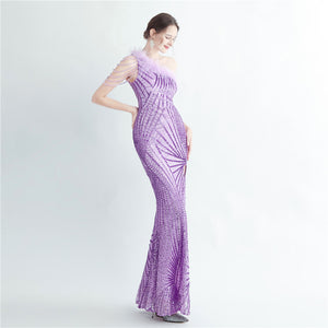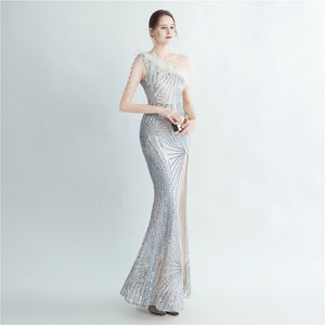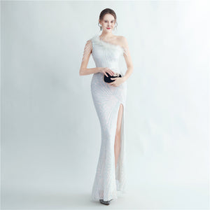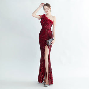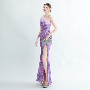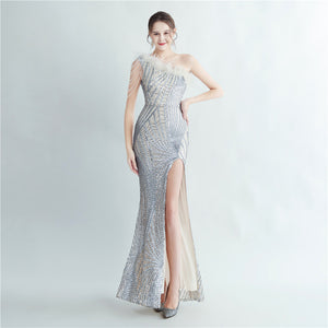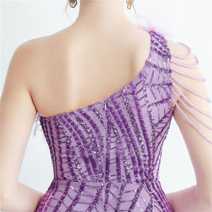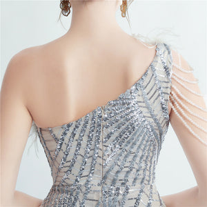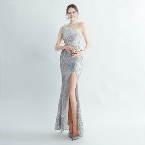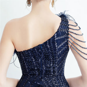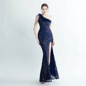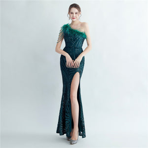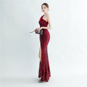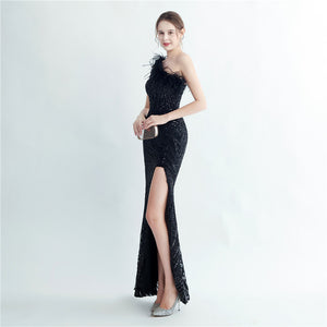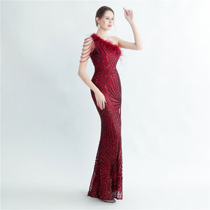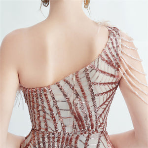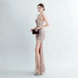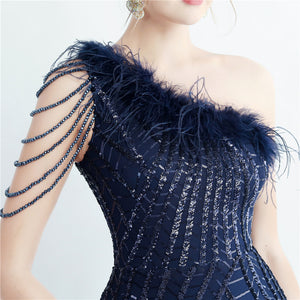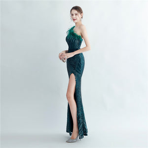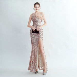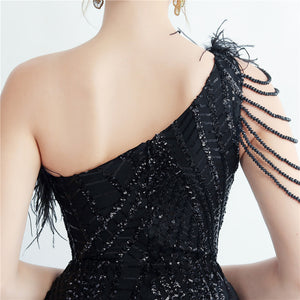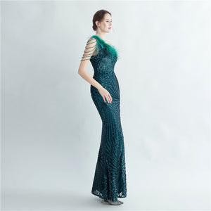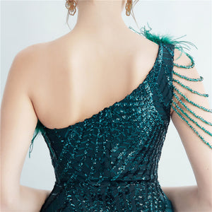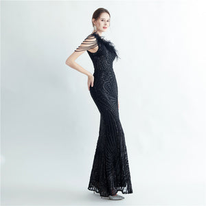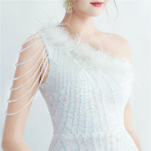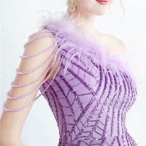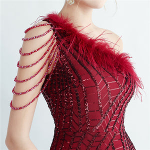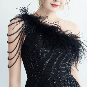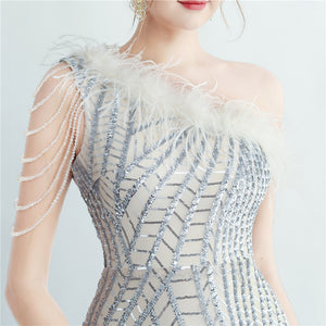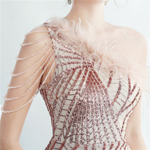 High-density layered sequins + ostrich feather detailing + crafted beadwork, with chest pads