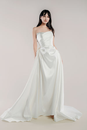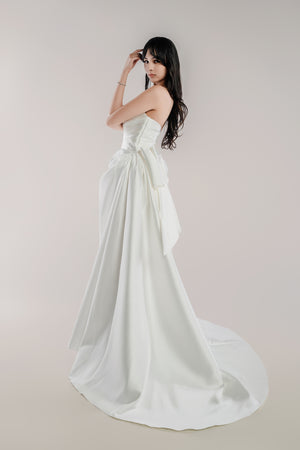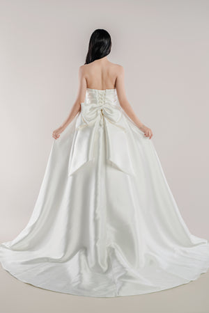 Crafted in smooth satin, the strapless A-line silhouette flows effortlessly, cinched with asymmetrical pleats that flatter the waist. The back reveals a dramatic oversized bow, adding a touch of romantic charm, while the soft sweep train completes the look with timeless elegance.