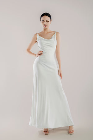 The silky cowl neckline softly frames the collarbone, while the fluid skirt follows each step with graceful ease.