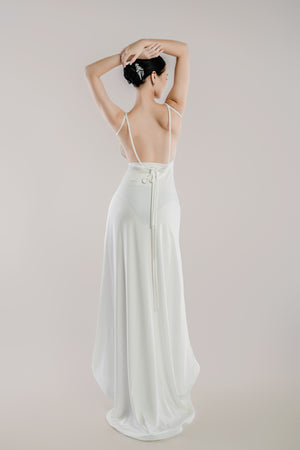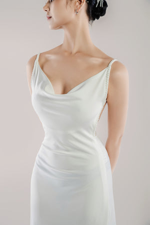 Backless Cowl Neck Satin Slip Wedding Dress With Spaghetti Straps and Sweep Train - Selene. WL Bridal & Gown