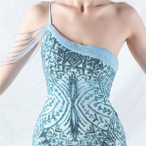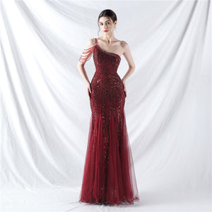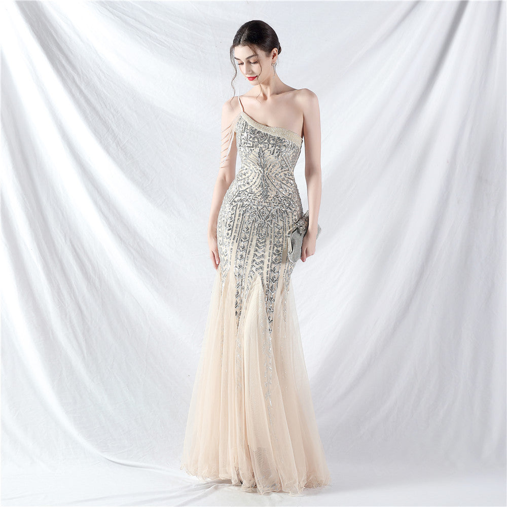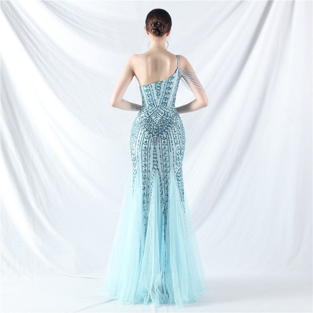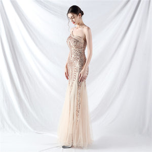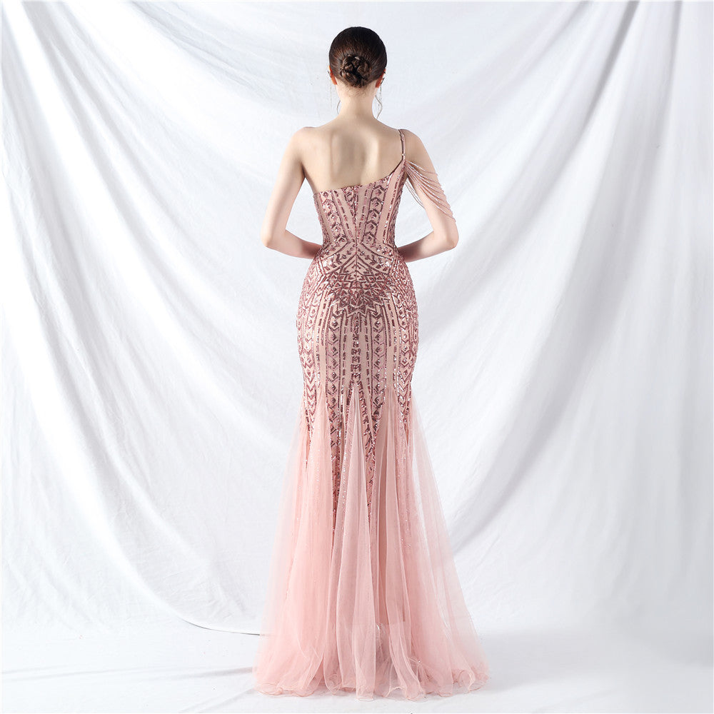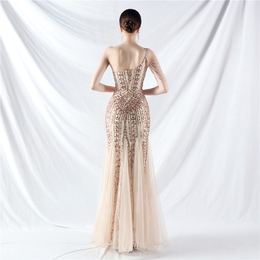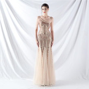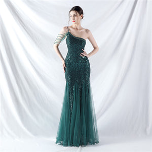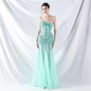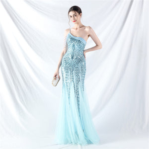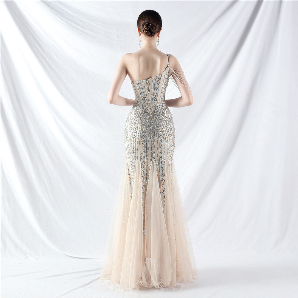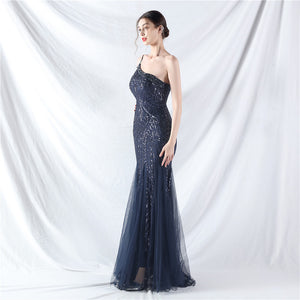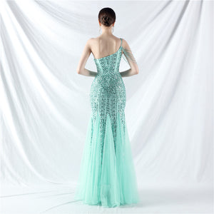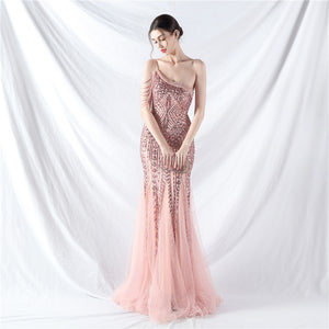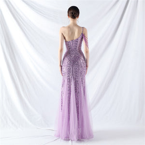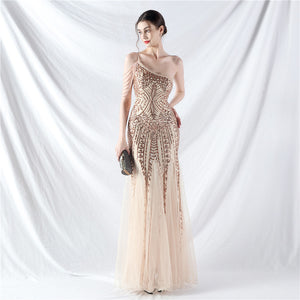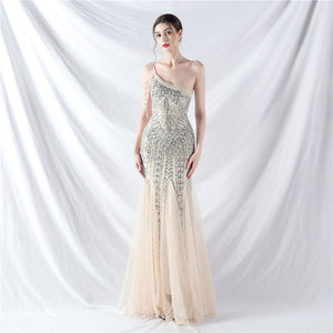 Beaded Patchwork Mesh One Shoulder Formal Gown