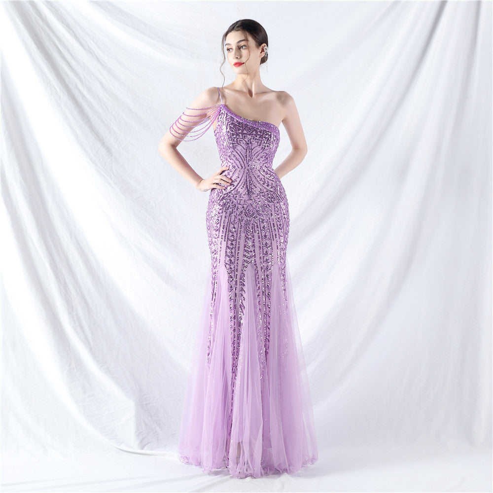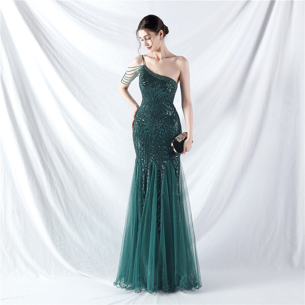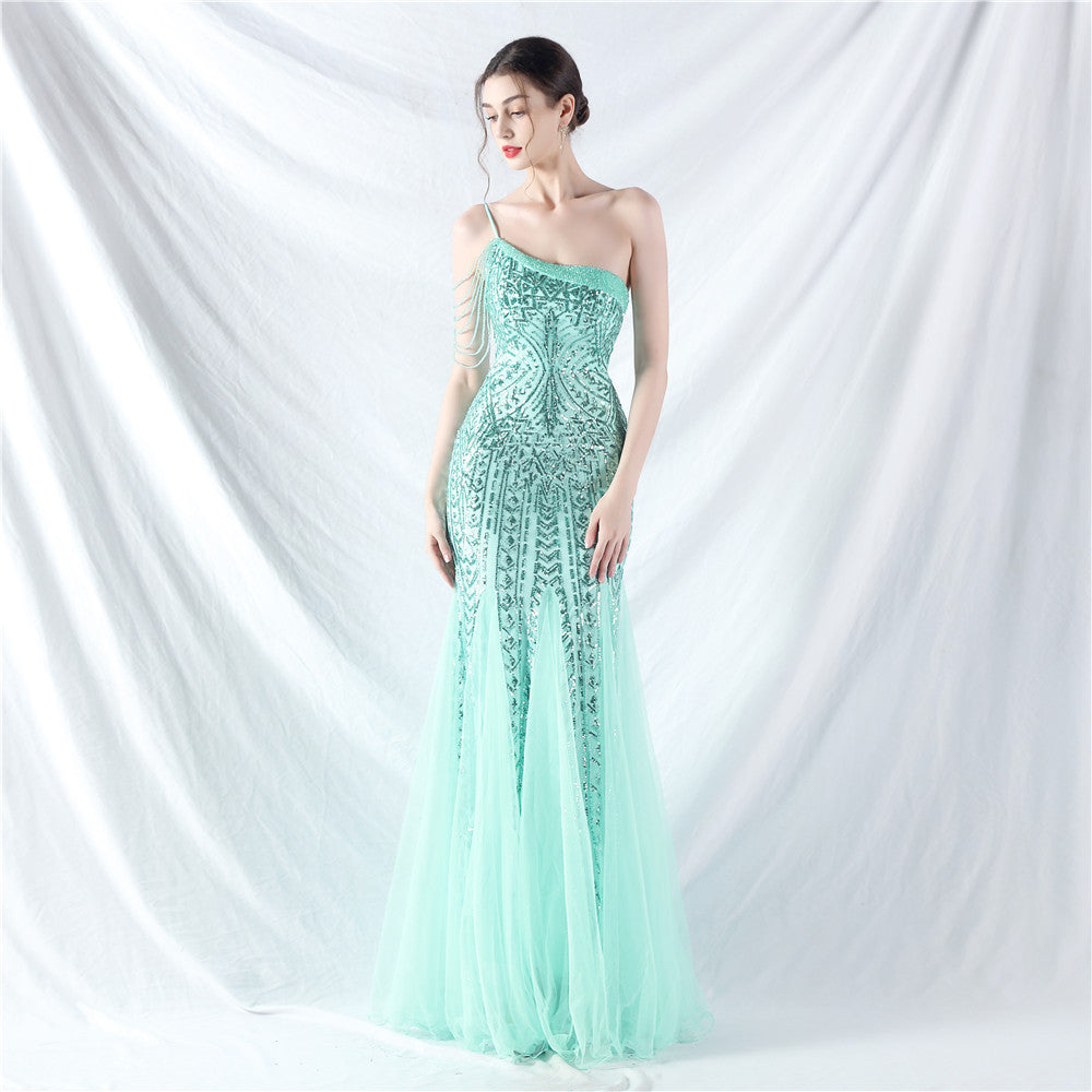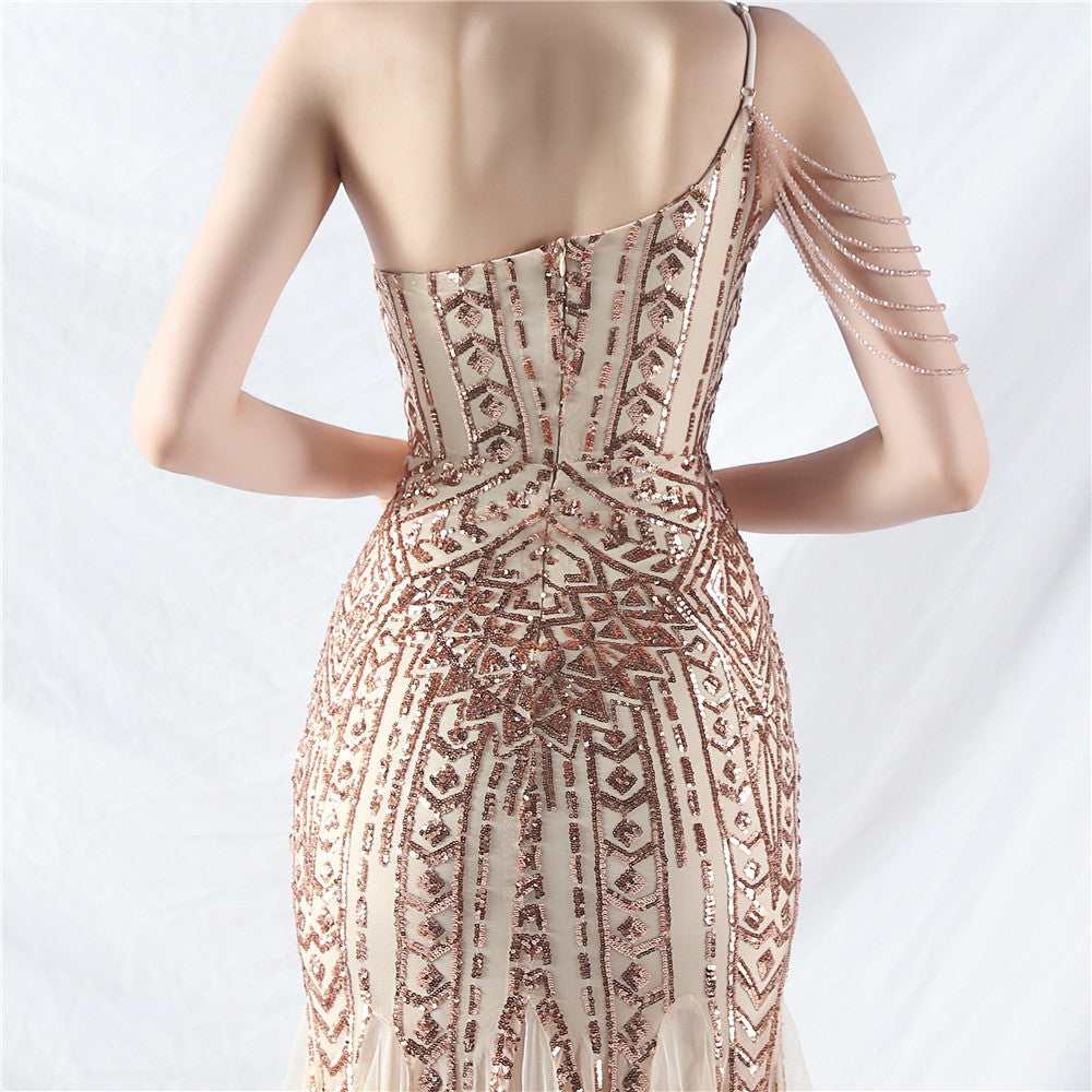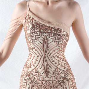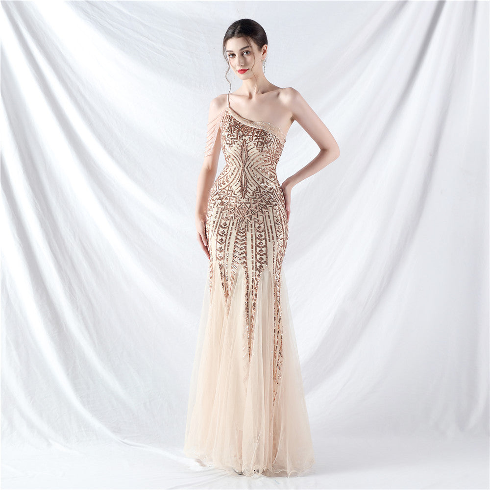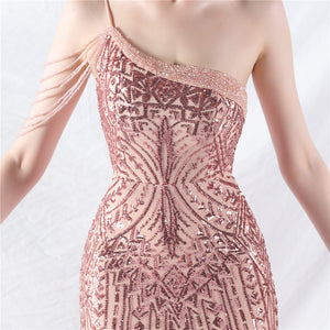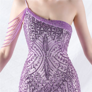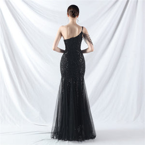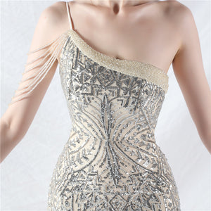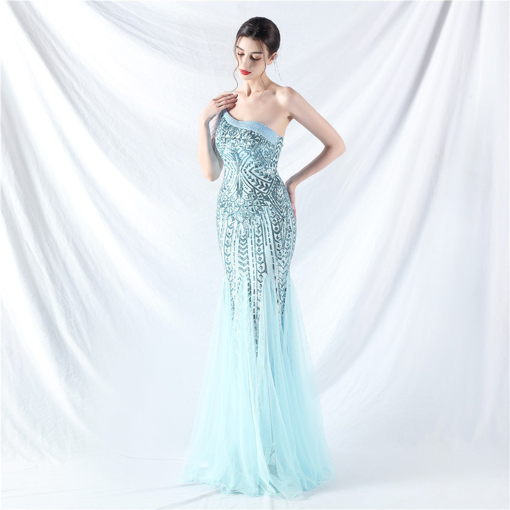 Beaded Patchwork Mesh One Shoulder Formal Gown