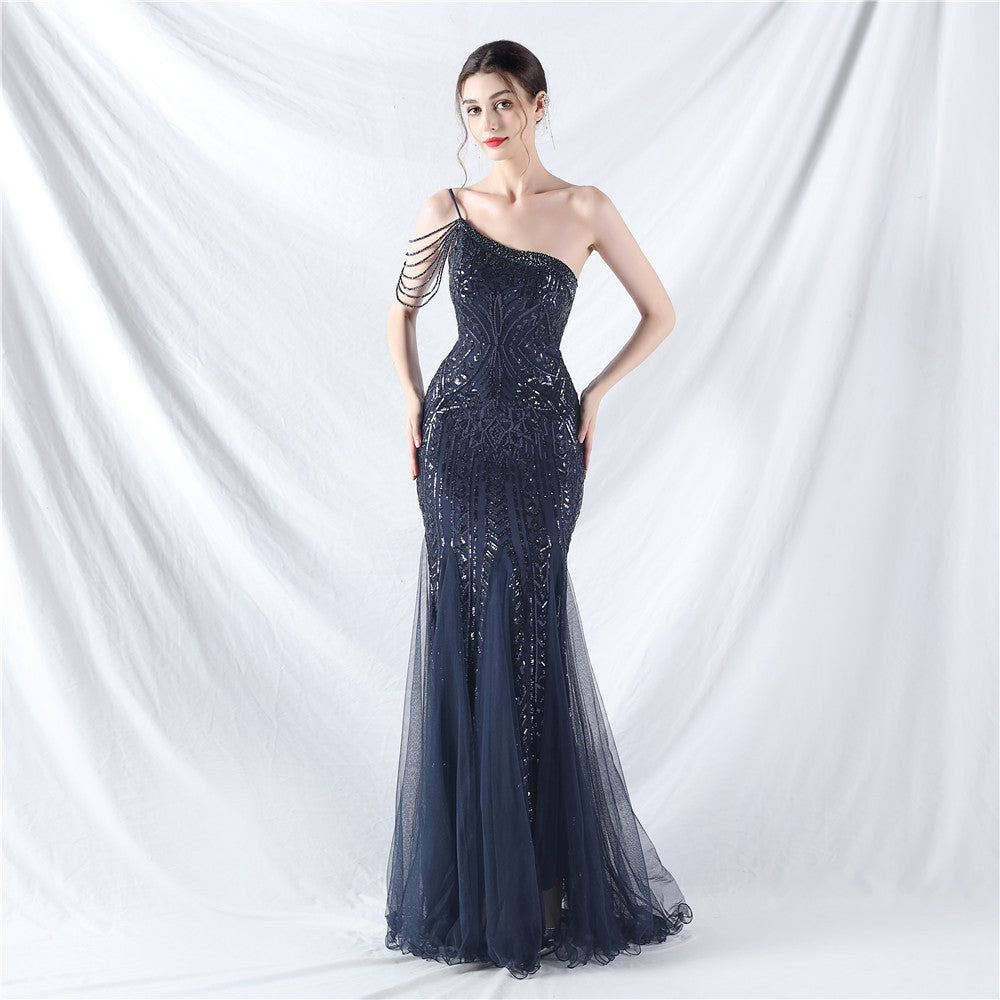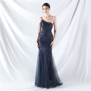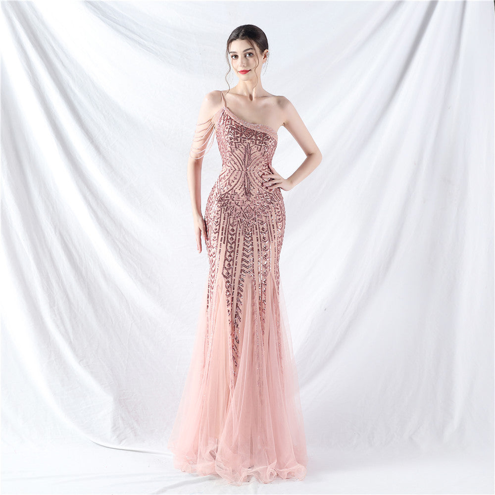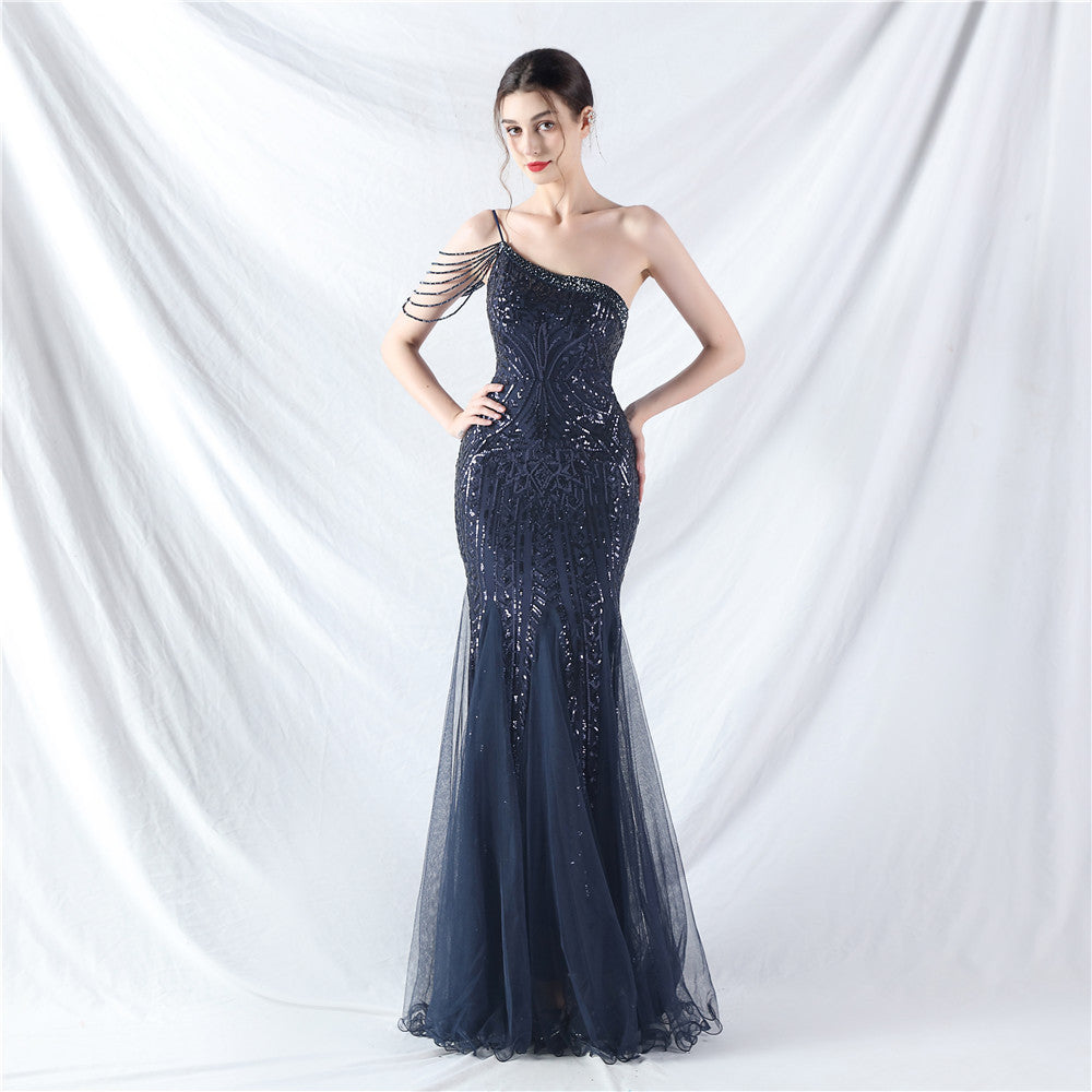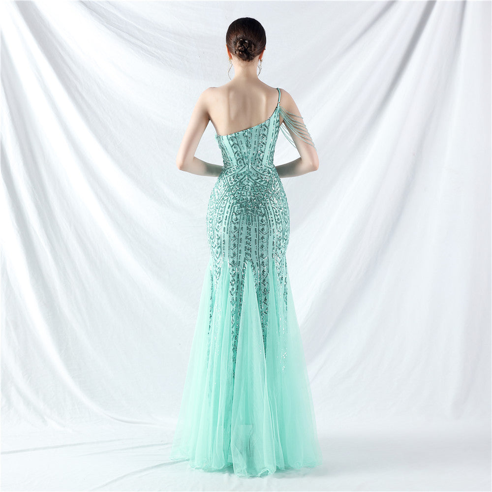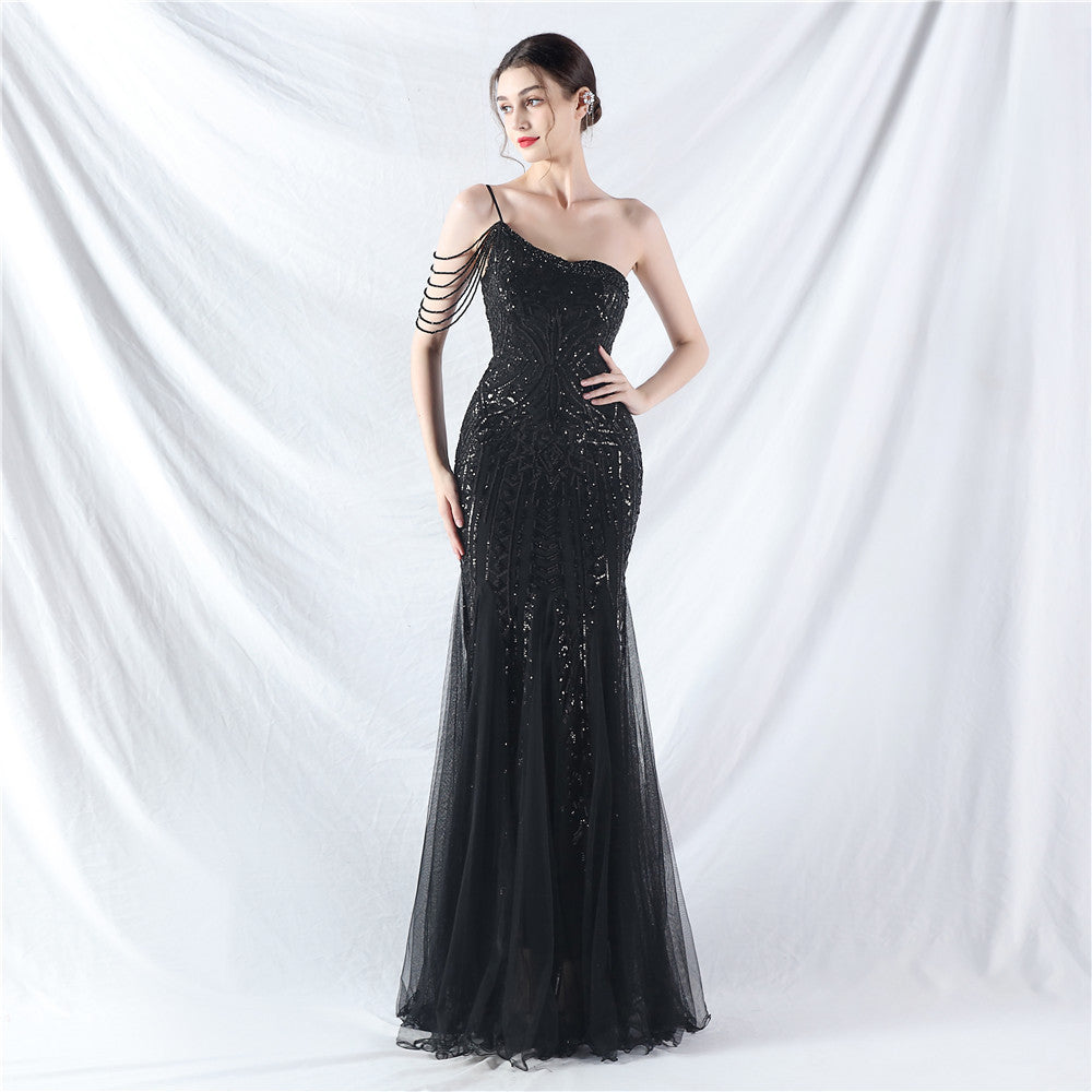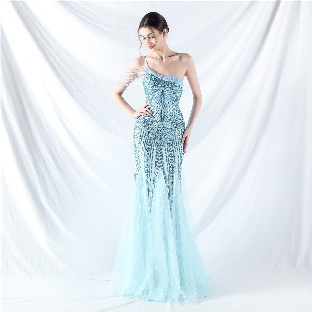 Beaded Patchwork Mesh One Shoulder Formal Gown