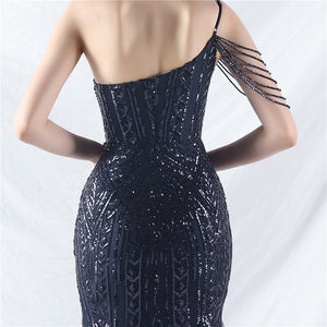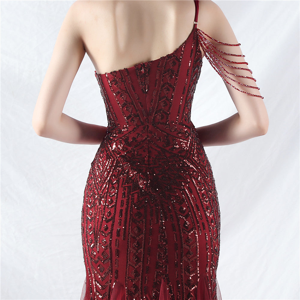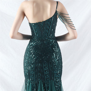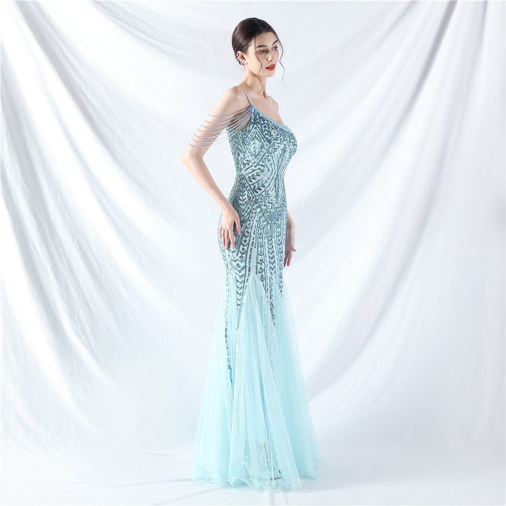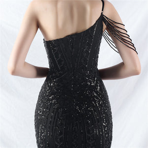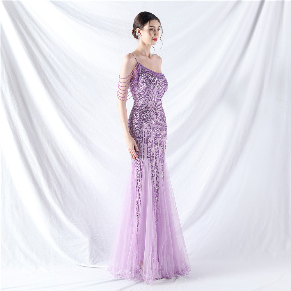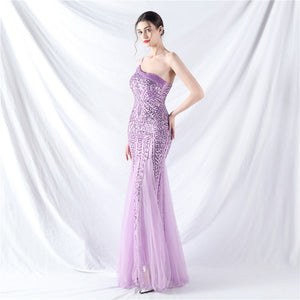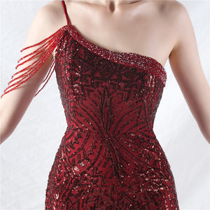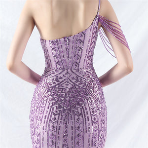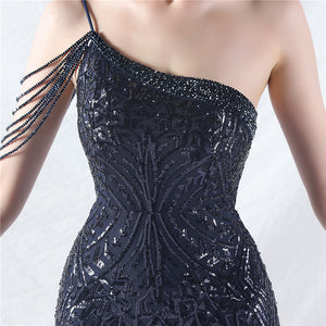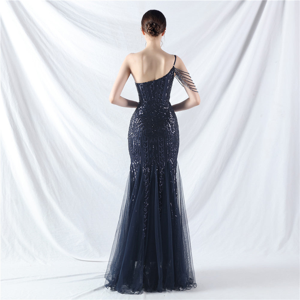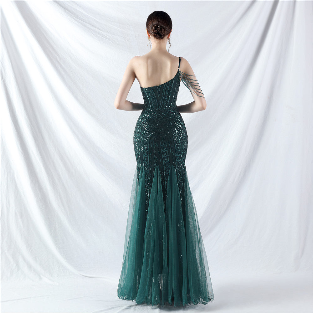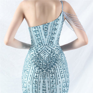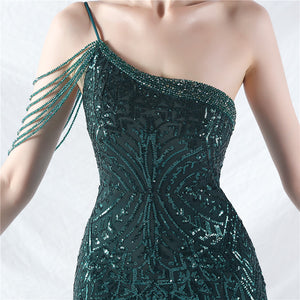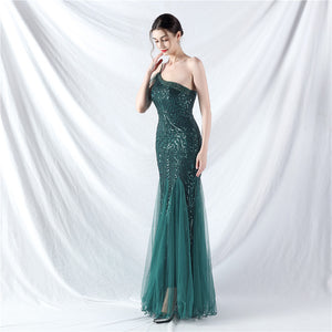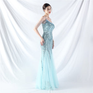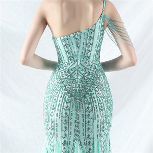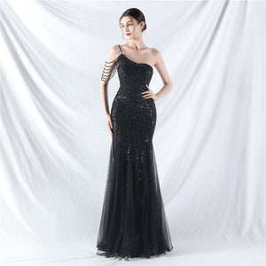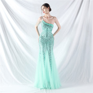 Beaded Patchwork Mesh One Shoulder Formal Gown
