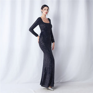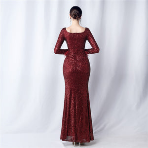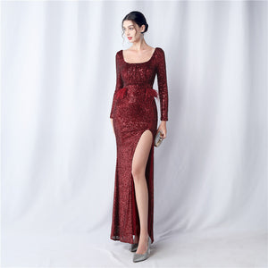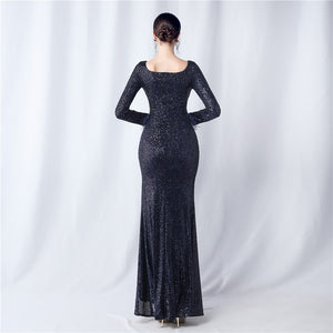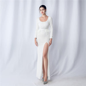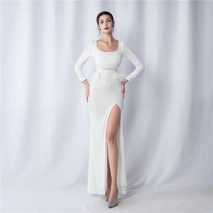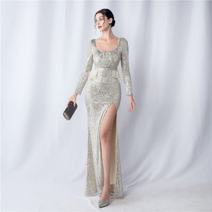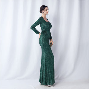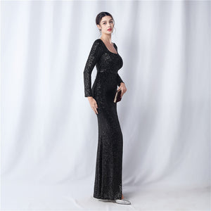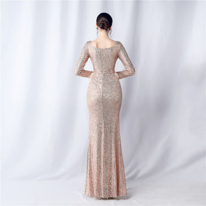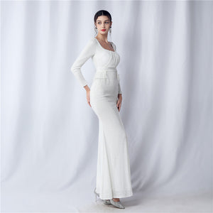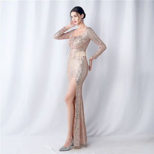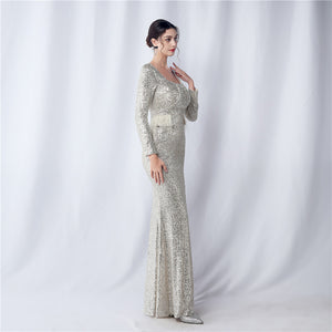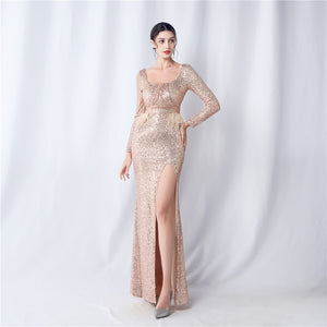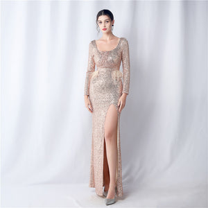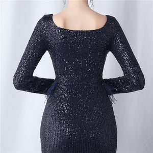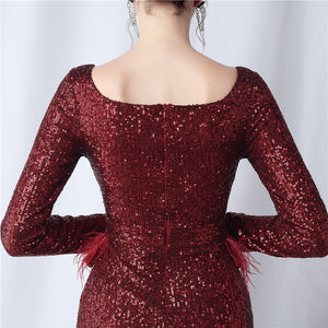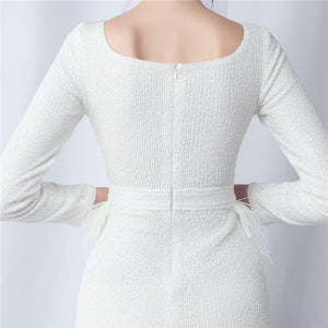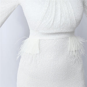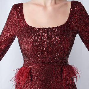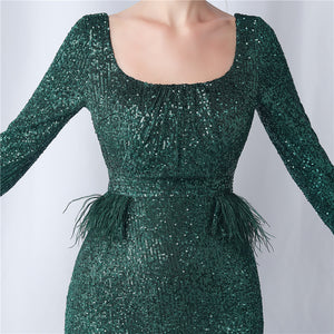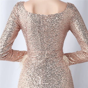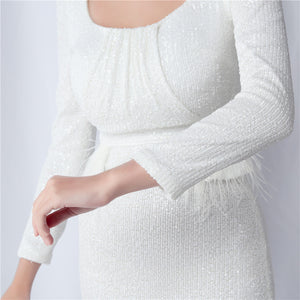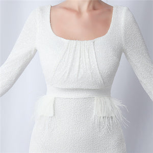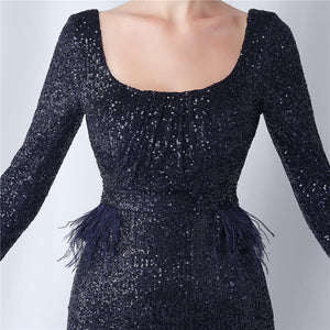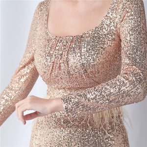 Ostrich Fur Beaded Long Sleeve Formal Dress