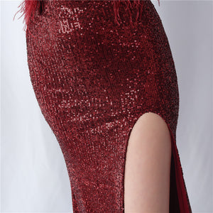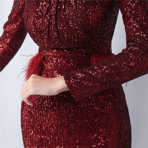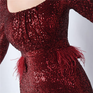 Sequin Long Sleeves + Crafted Ostrich Feather Design with Built-in Chest Pads