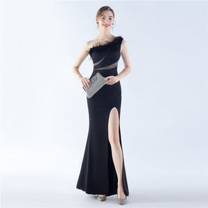 Heat-set rhinestone detailing with ostrich feather embellishments, built-in bra.