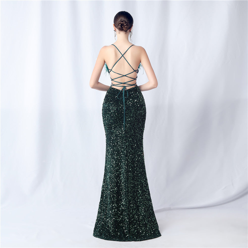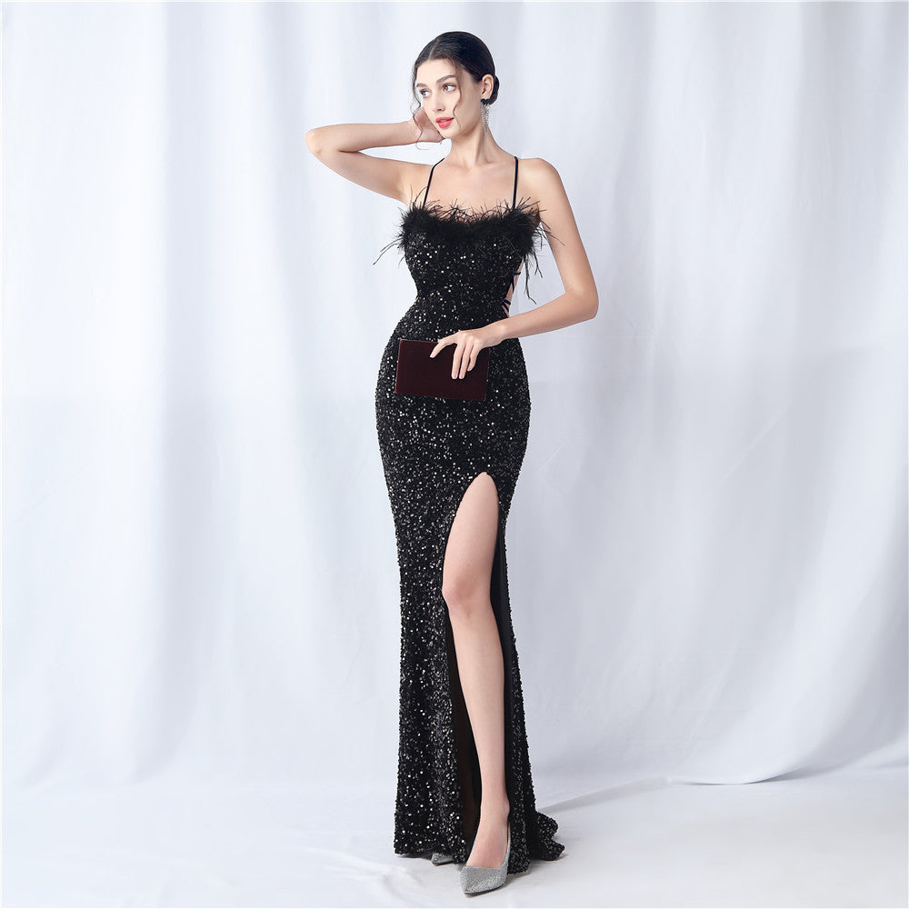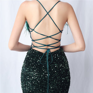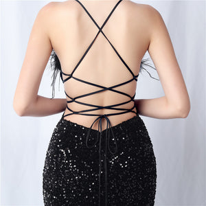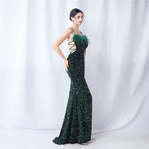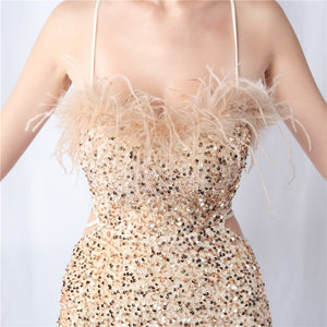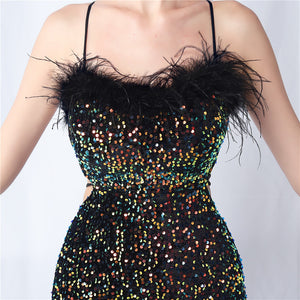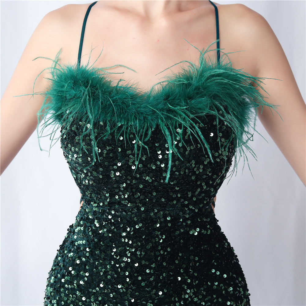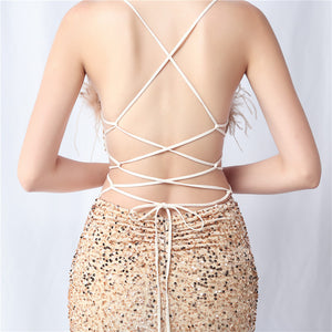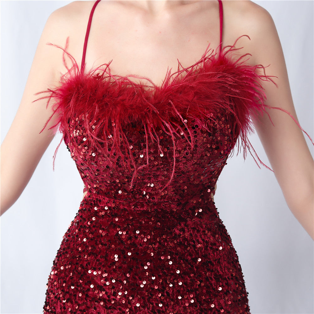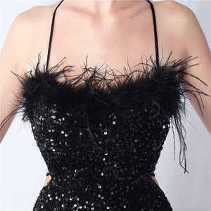 Velvet base with hand-sewn sequins + ostrich feather detailing, with chest pads