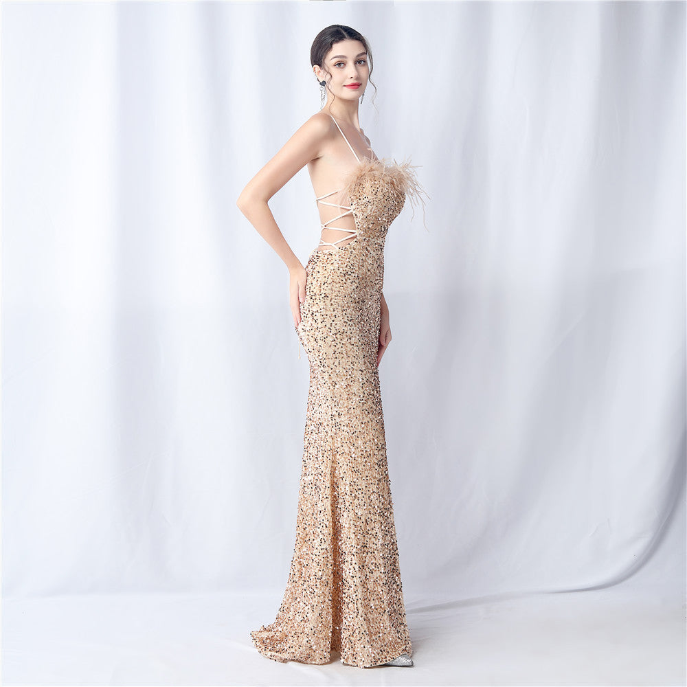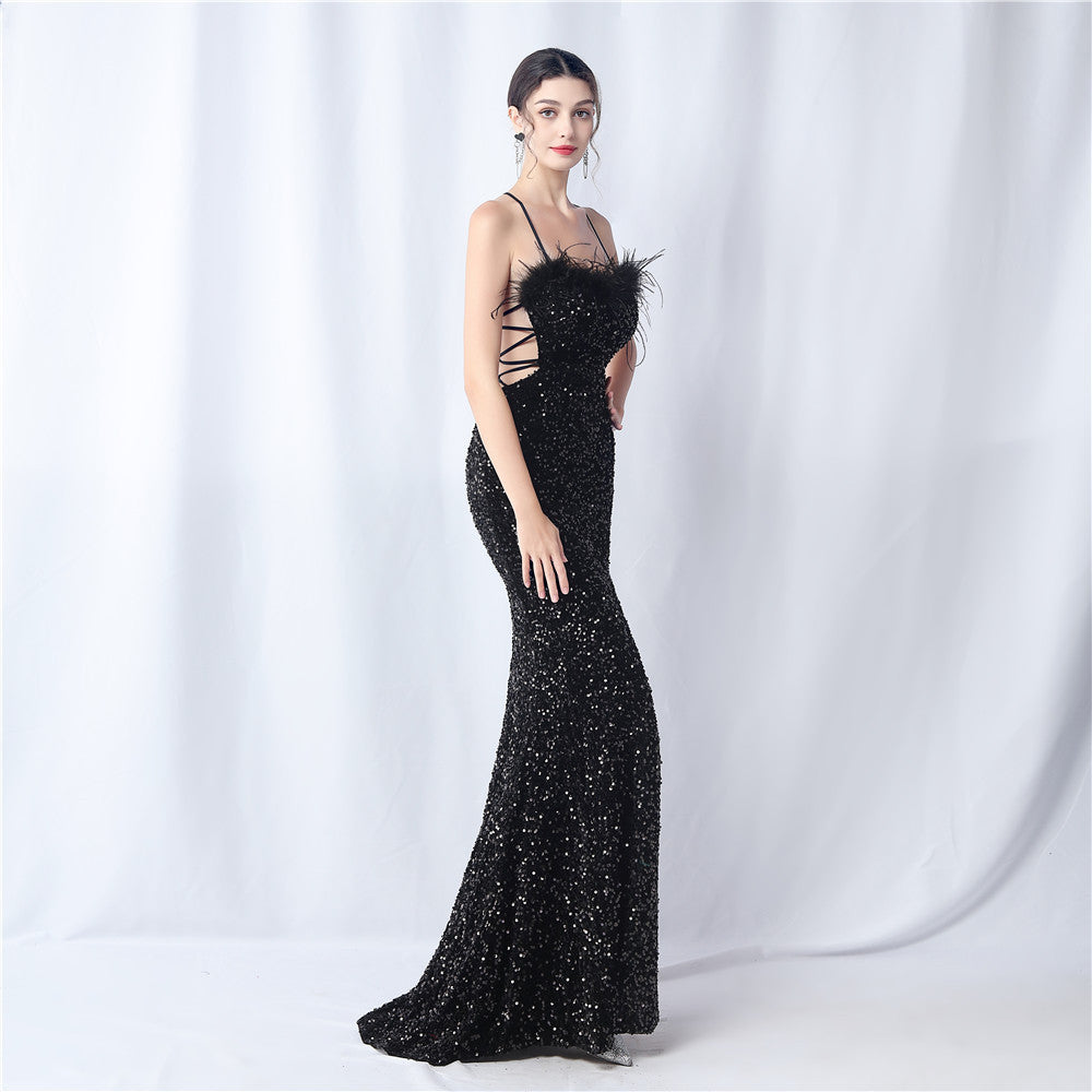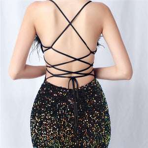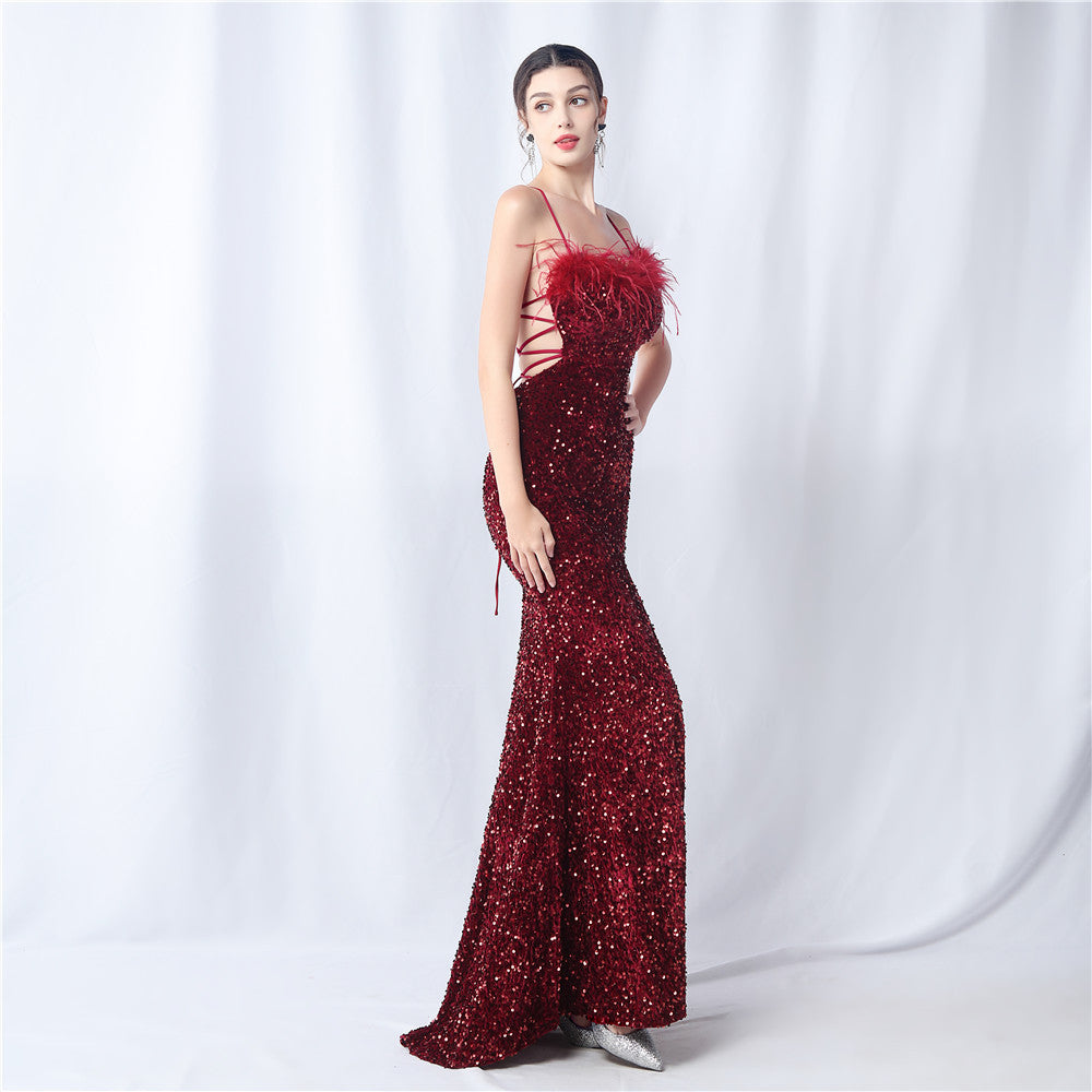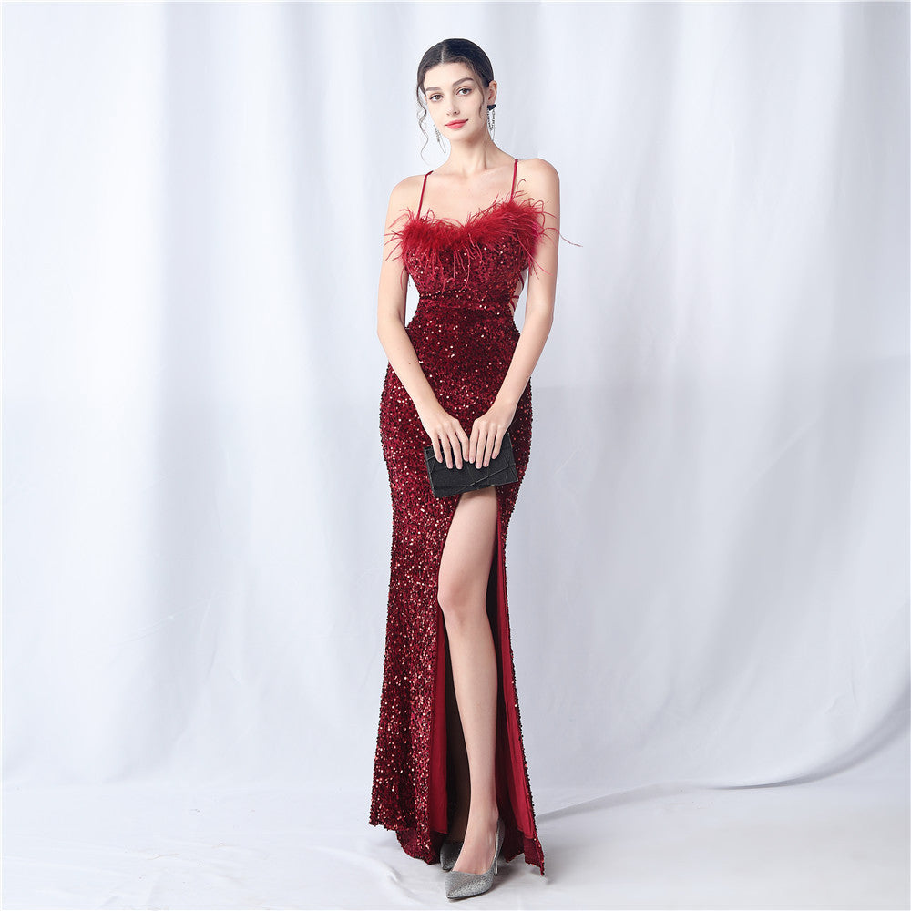 Velvet base with hand-sewn sequins + ostrich feather detailing, with chest pads