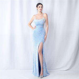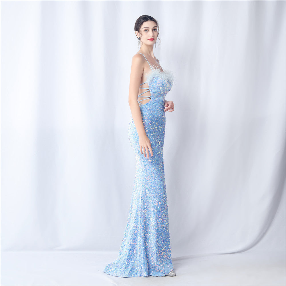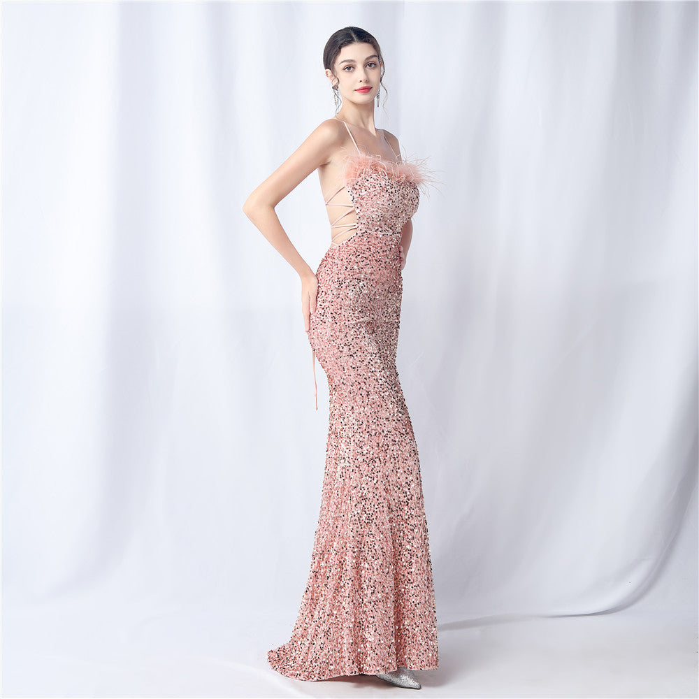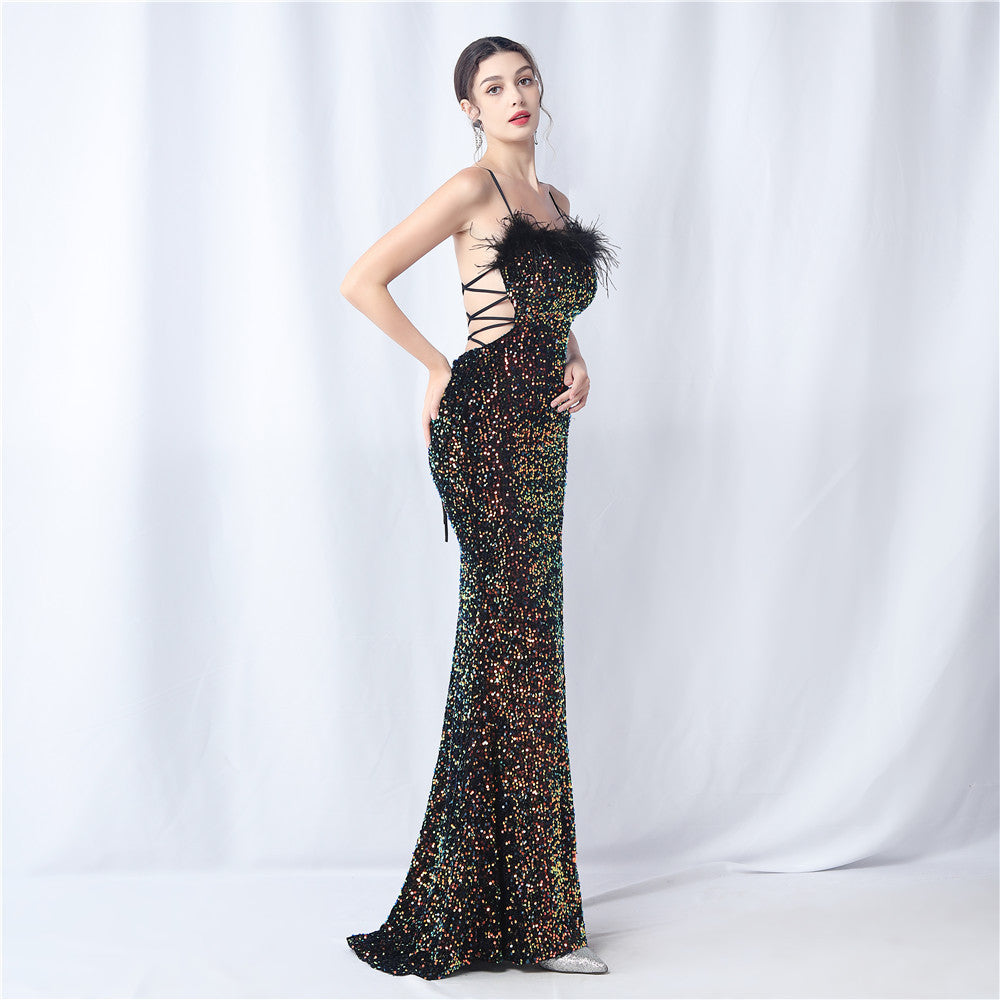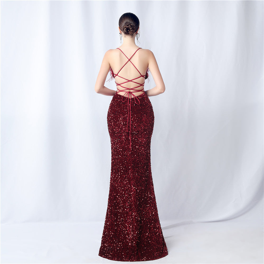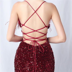 Velvet base with hand-sewn sequins + ostrich feather detailing, with chest pads