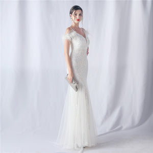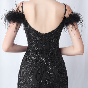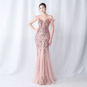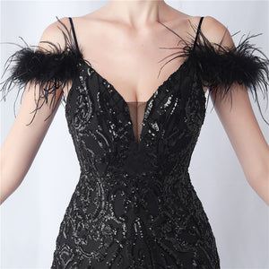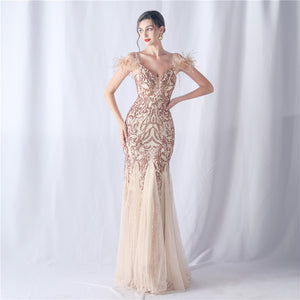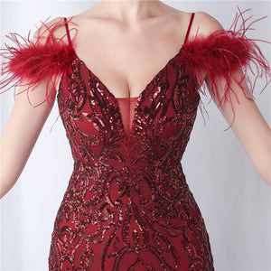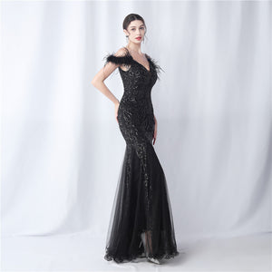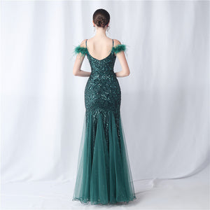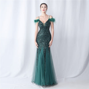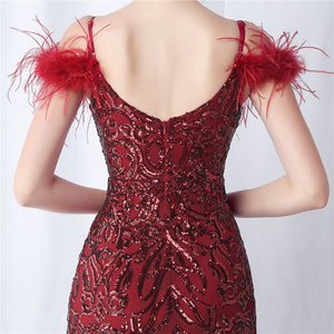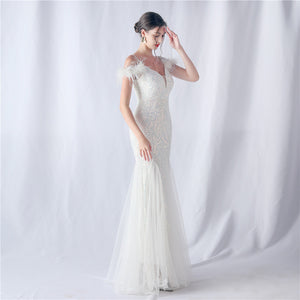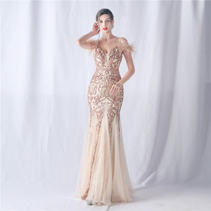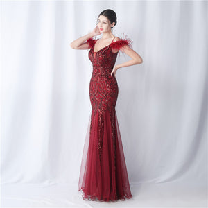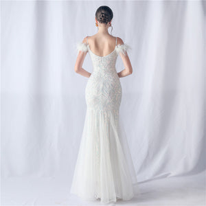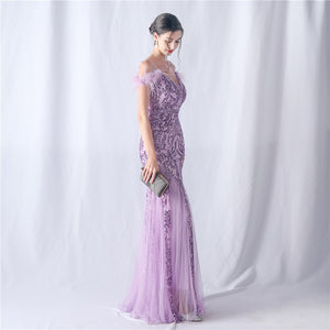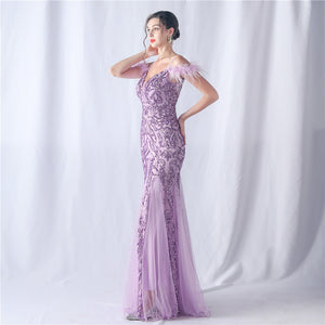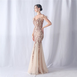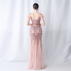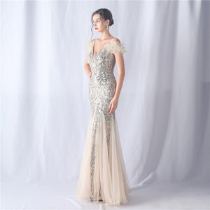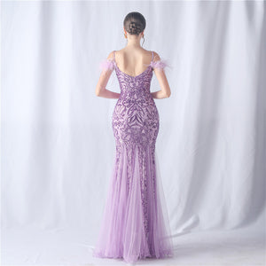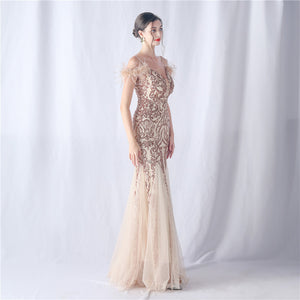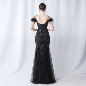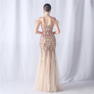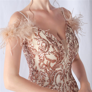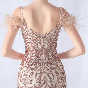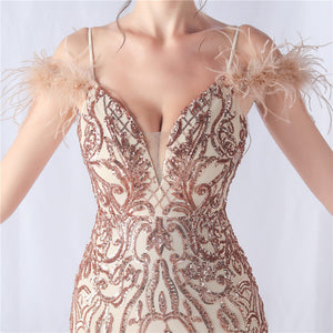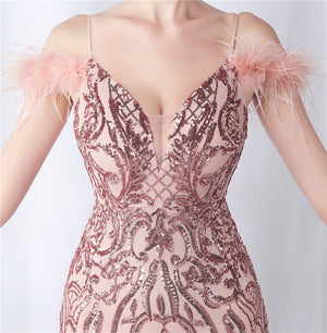 Floral sequins with tulle and fur trim, features a built-in bra.