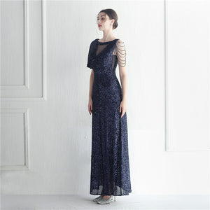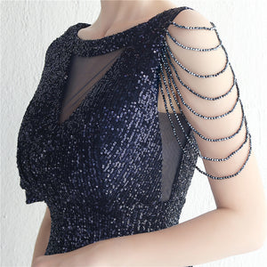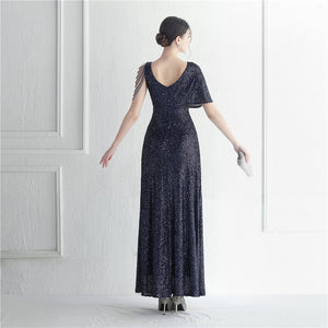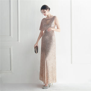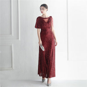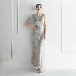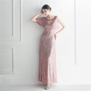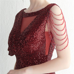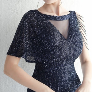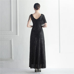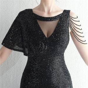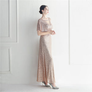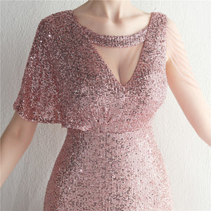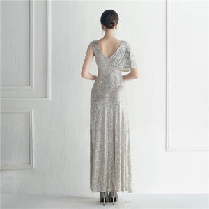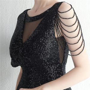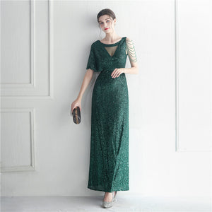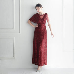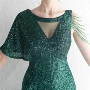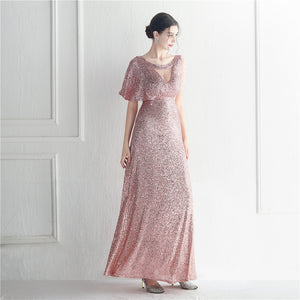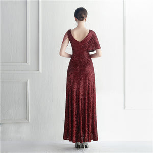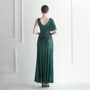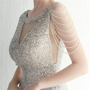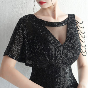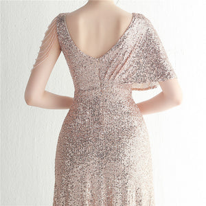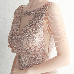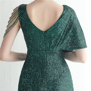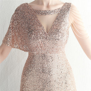 Sequins with Intricate Beading, A-Line Skirt Design, Ruffled Sleeves, and Built-in Chest Pads