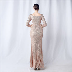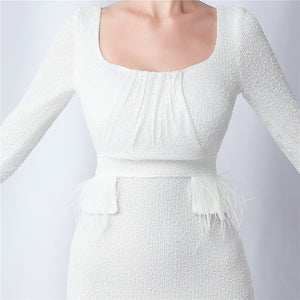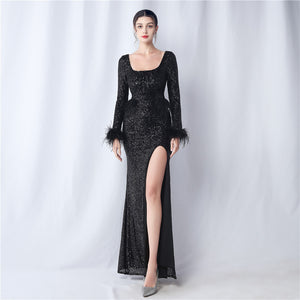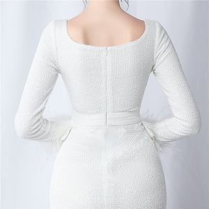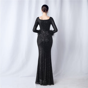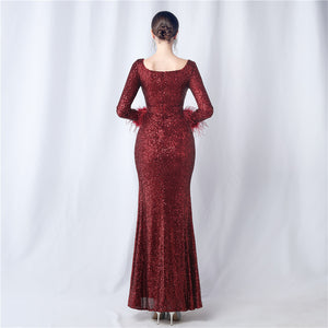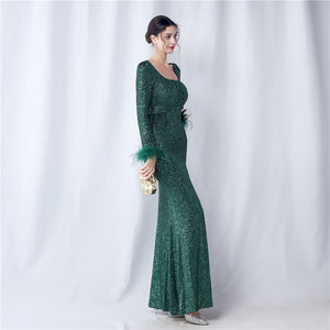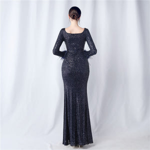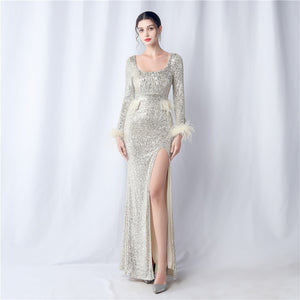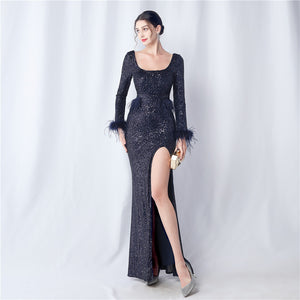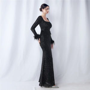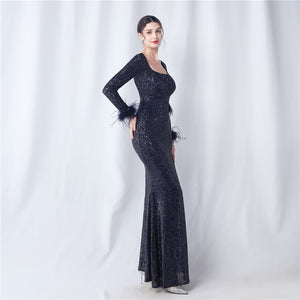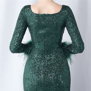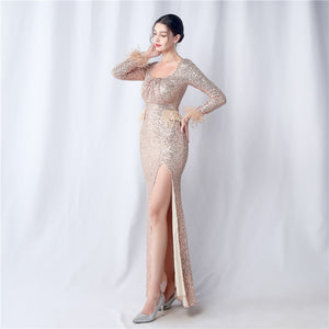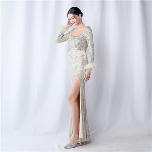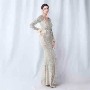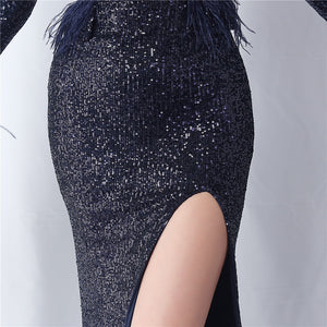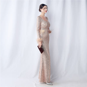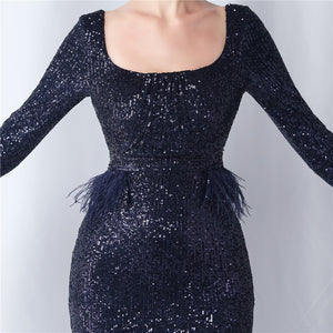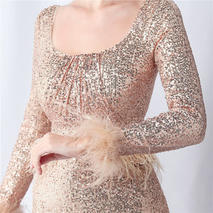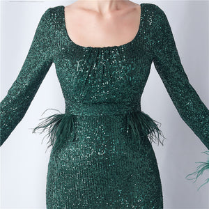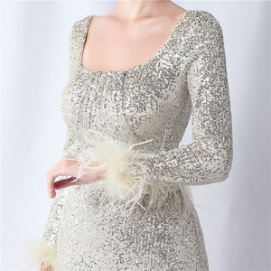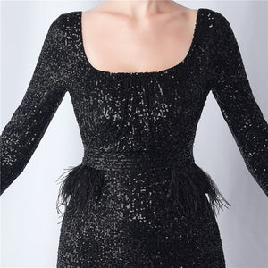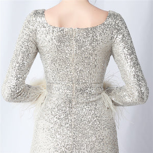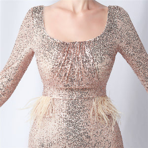 Sequin long sleeves with intricate ostrich feather detailing, includes built-in chest pads