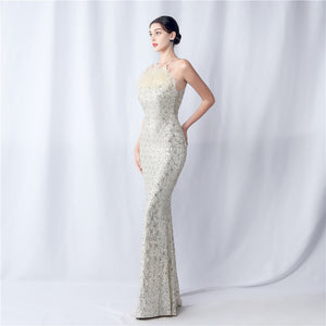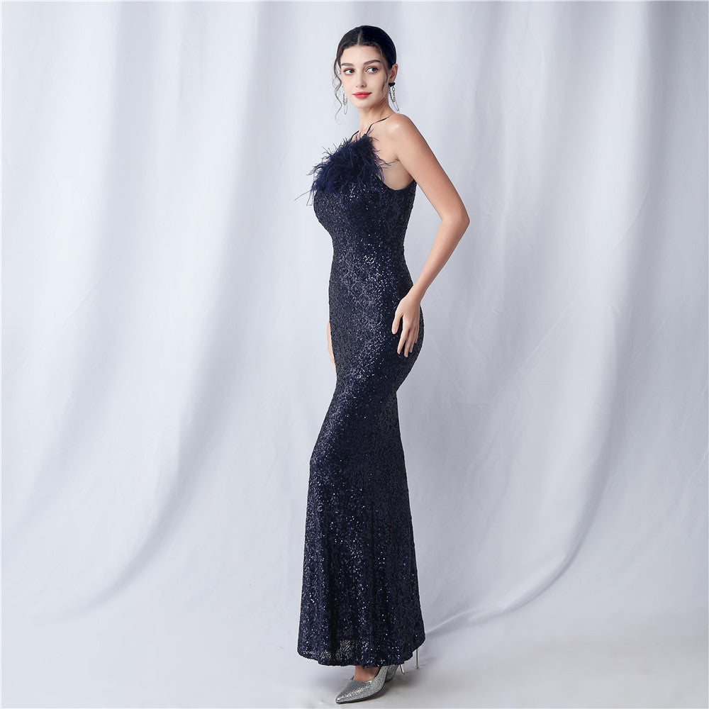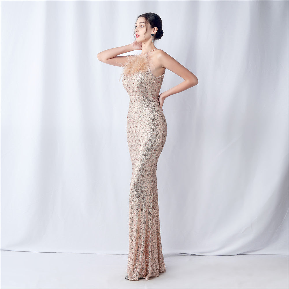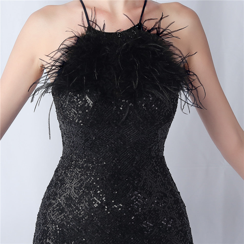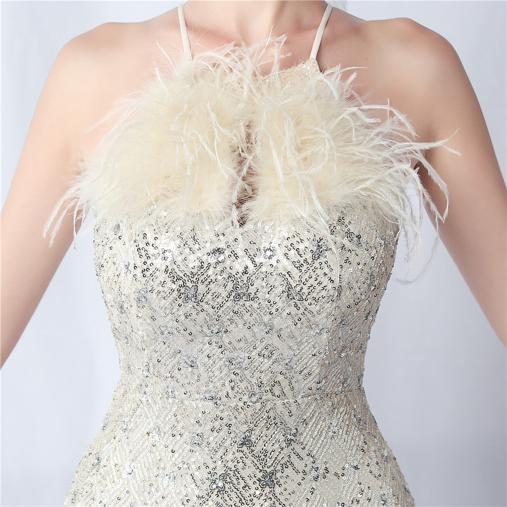 Plaid sequin with hand-sewn beading and ostrich feather detailing, includes built-in chest pads.
