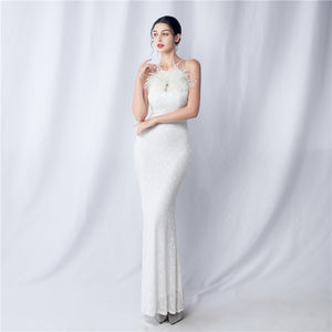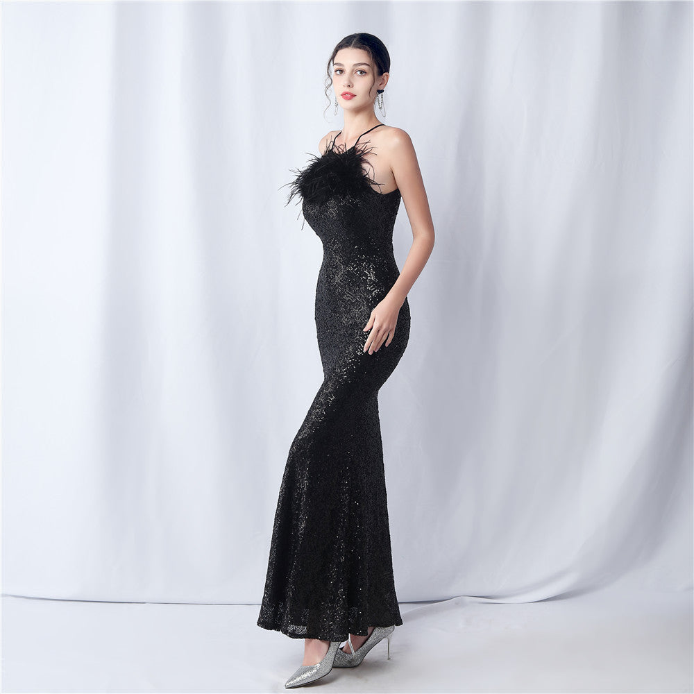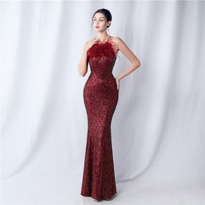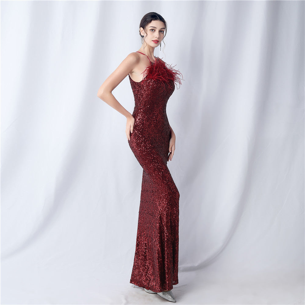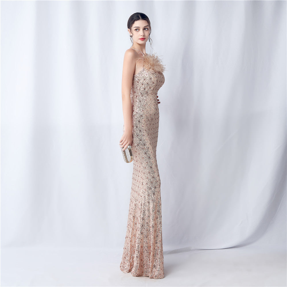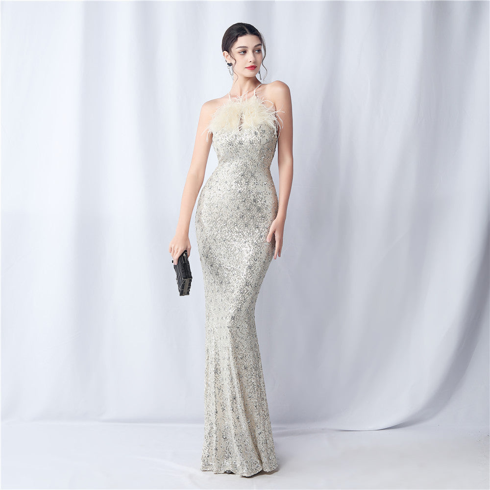 Plaid sequin with hand-sewn beading and ostrich feather detailing, includes built-in chest pads.